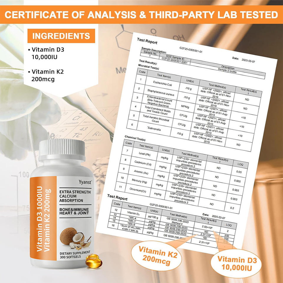 อาหารเสริมสำหรับผู้ใหญ่แบบ OEM/ODM บำรุงสุขภาพกระดูก หัวใจ ข้อต่อ วิตามิน D3 K2 ซอฟเจล ปรับปรุงสูตรได้ น้ำตาลต่ำ