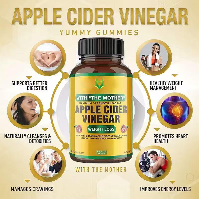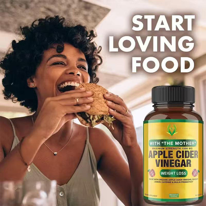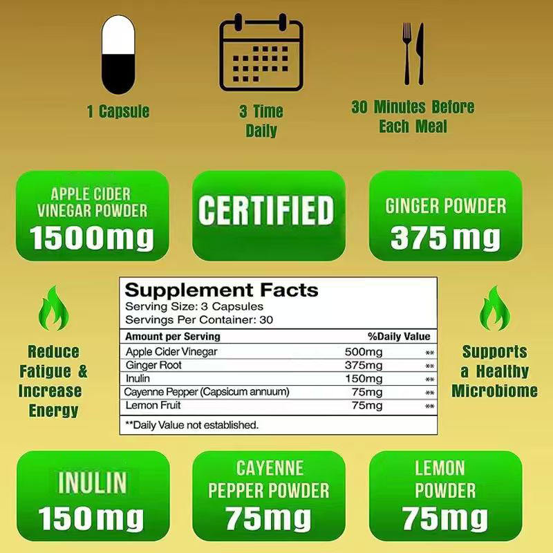 แคปซูลน้ำส้มสายชูหมักแอปเปิ้ล OEM ODM ผสมสารสกัดรากขิงและอินนูลิน 1500 มก. ช่วยควบคุมน้ำหนัก แคปซูล ACV