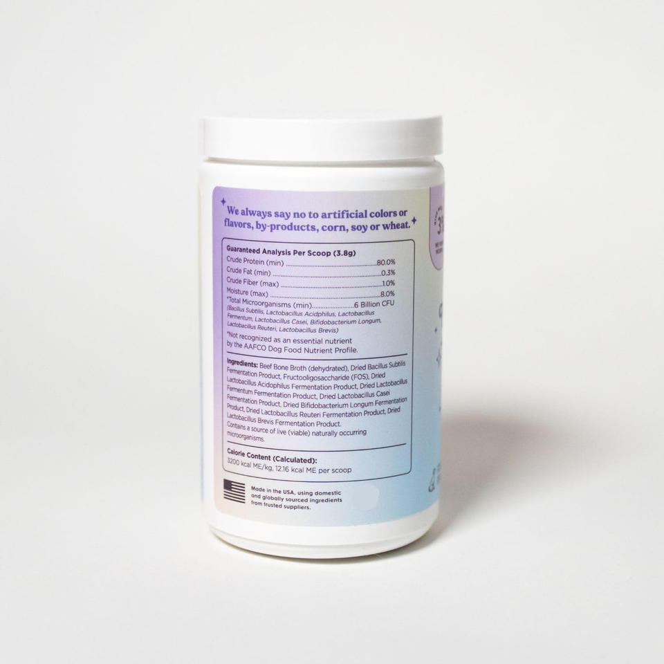 อาหารเสริมโปรไบโอติกและพรีไบโอติกสำหรับสุนัข OEM/ODM สูตรน้ำซุปกระดูกเนื้อวัว ช่วยเสริมภูมิคุ้มกันทางเดินอาหารชนิดผง