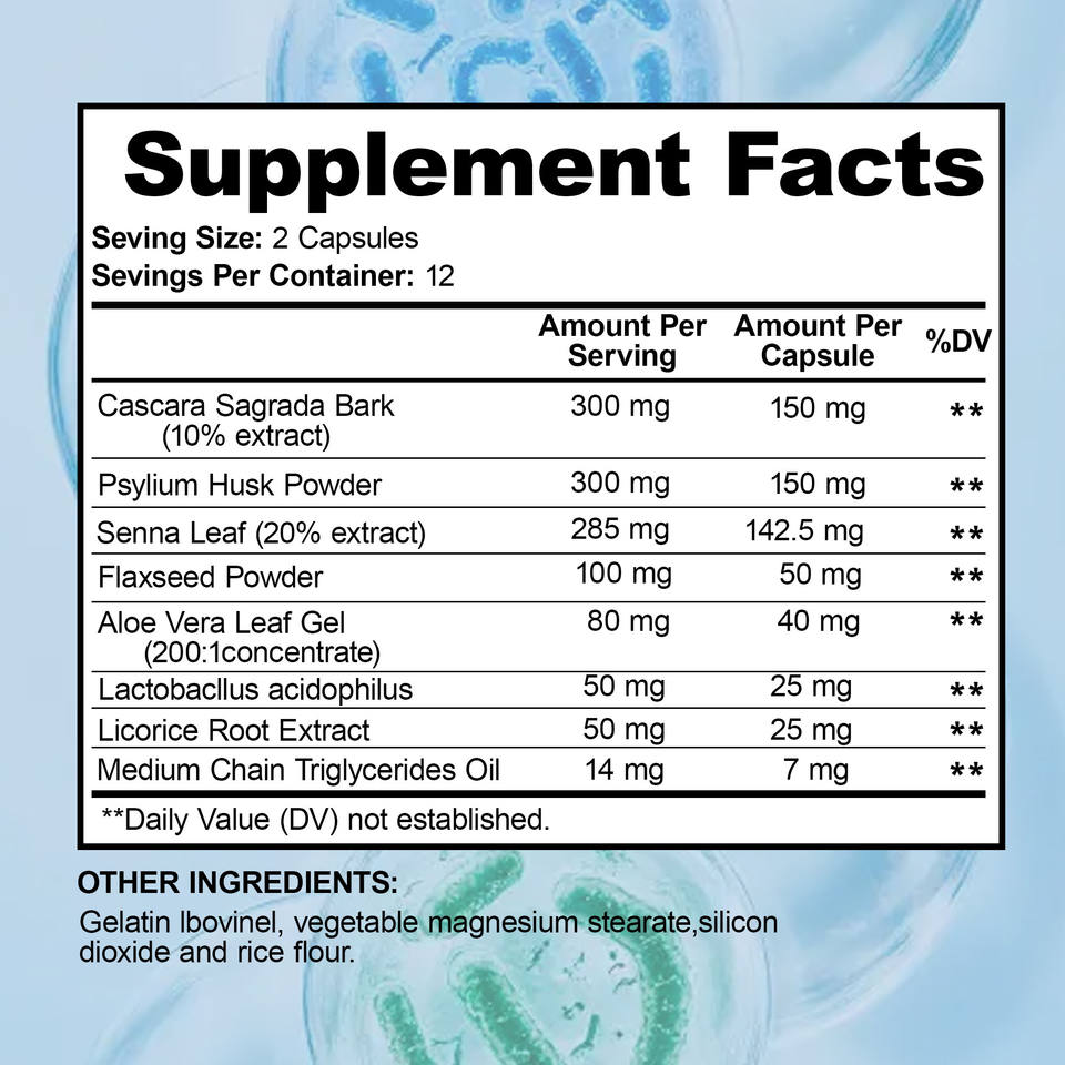 Main Ingredient:Cascara Sagrada Bark, Psylium Husk Powder, Senna Leaf, Aloe Vera Leaf Gel