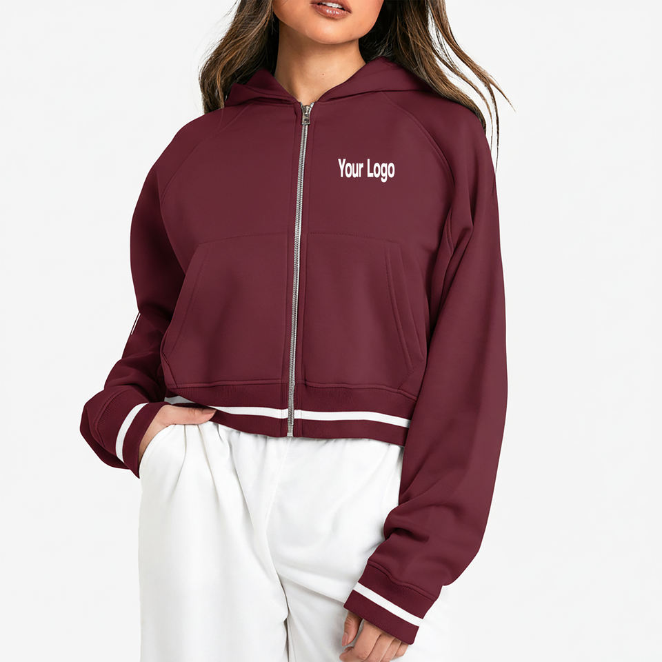 เสื้อฮู้ดครอปท็อปแบบซิปสำหรับผู้หญิง สตรีทแวร์ ปักโลโก้ตามสั่ง OEM/ODM ผ้าถักแบบริบ สีพื้น สำหรับใส่ในฤดูร้อน