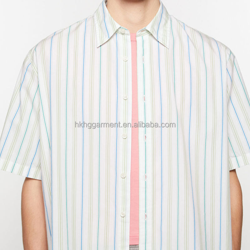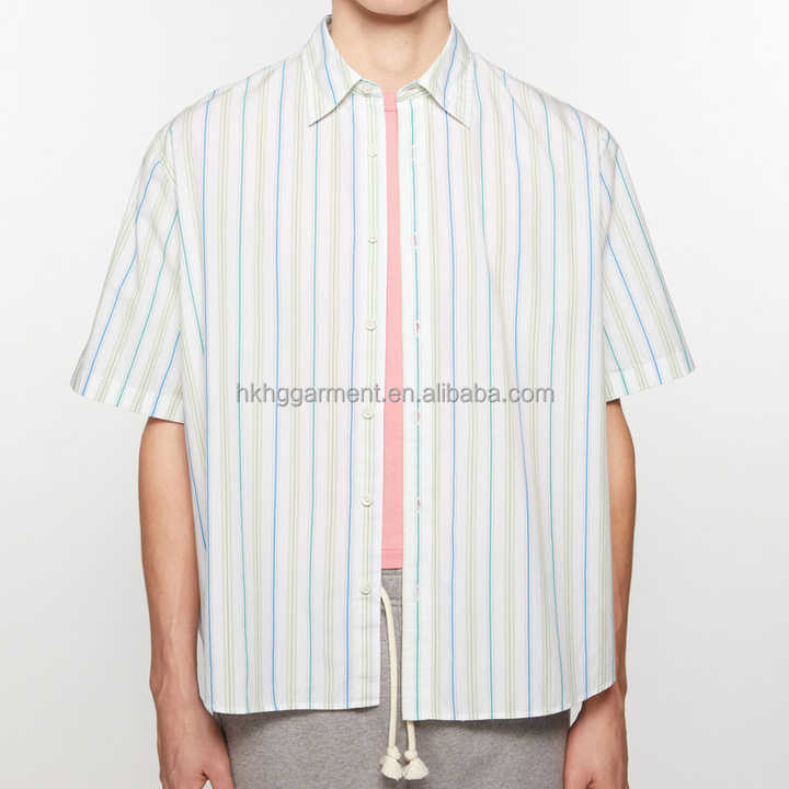 เสื้อเชิ้ตผู้ชายลายทางแบบสั่งทำ OEM & ODM พร้อมปักโลโก้ คอปกติดกระดุม สไตล์ลำลอง ไซส์ใหญ่ ทรงบ็อกซี่ แขนสั้น