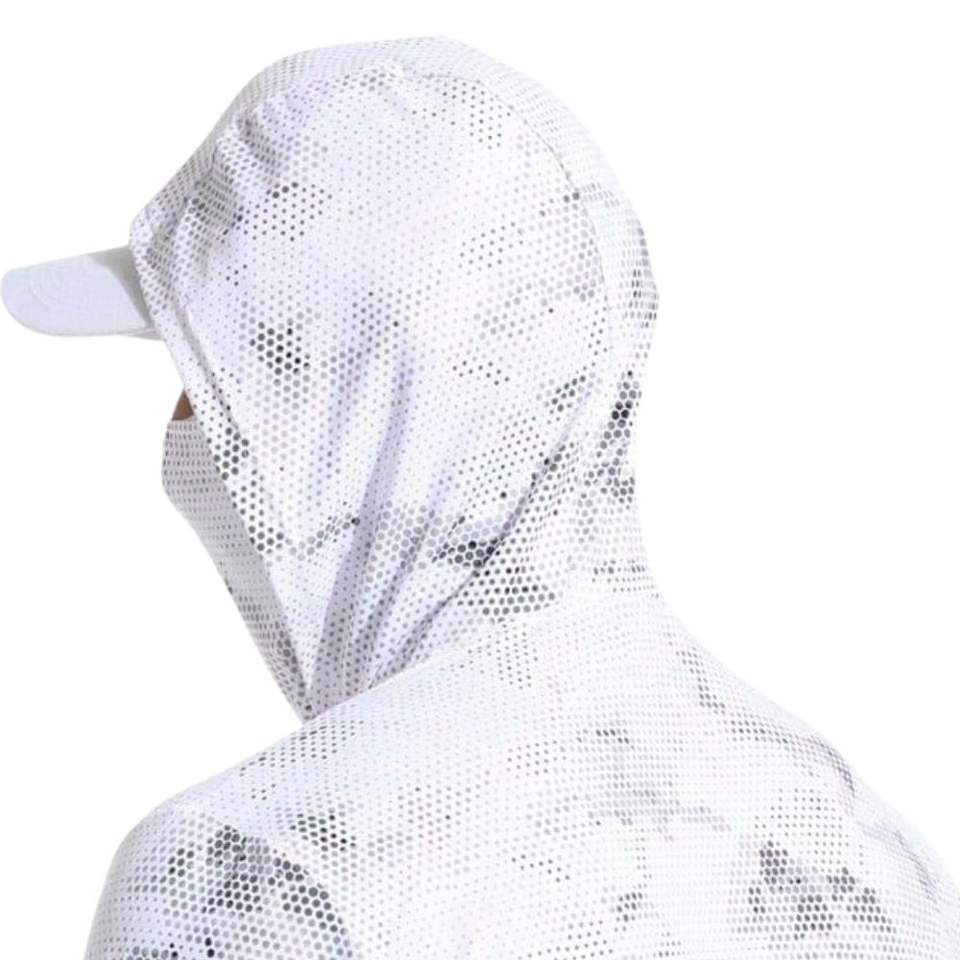 เสื้อฮู้ดดี้ตกปลาแบบซับลิเมชั่นพร้อมหน้ากากป้องกันรังสียูวีสำหรับทีมตกปลา รับผลิตแบบ OEM/ODM พร้อมสกรีนโลโก้ตามสั่ง ผลิตจากผ้าสแปนเด็กซ์/โพลีเอสเตอร์