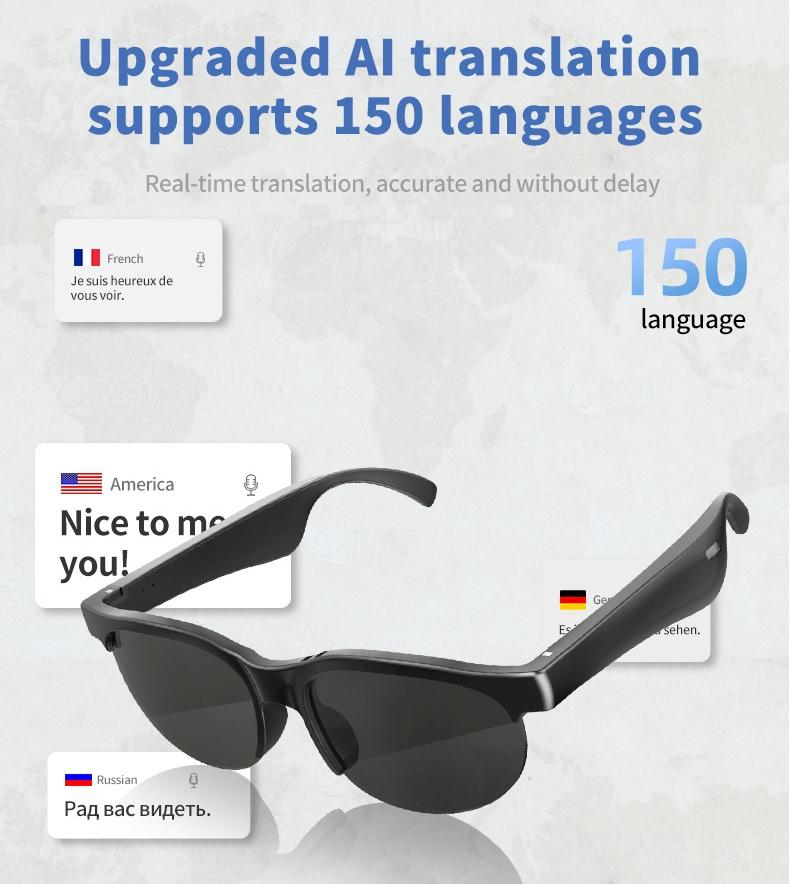 แว่นตาอัจฉริยะไร้สาย OEM ODM รับทำโลโก้ พร้อมระบบ AI ผู้ช่วยเสียง โทรออกด้วยบลูทูธ เล่นเพลง และแปลภาษาด้วย AI