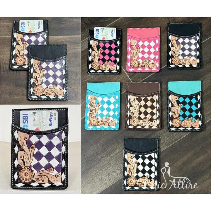 กระเป๋าสตางค์ใส่บัตรเครดิตหนังแท้ลายตารางหมากรุกทำมือ