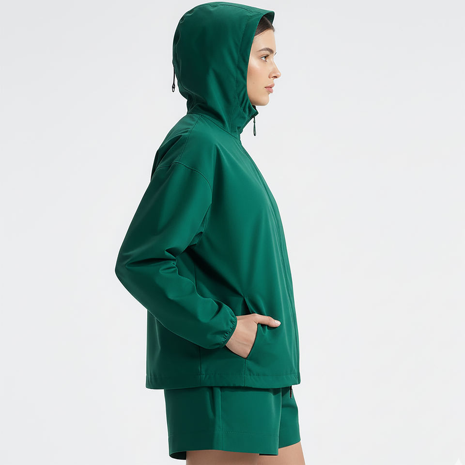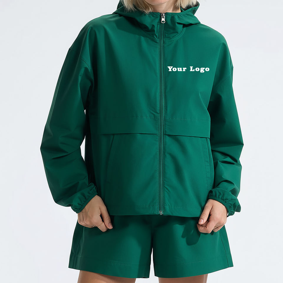 ชุดเซ็ตเสื้อแจ็คเก็ตและกางเกงขาสั้นสีพื้นทรงหลวมสำหรับผู้หญิง แบบกันลมและกันน้ำ สไตล์ลำลอง รับผลิตแบบ OEM/ODM