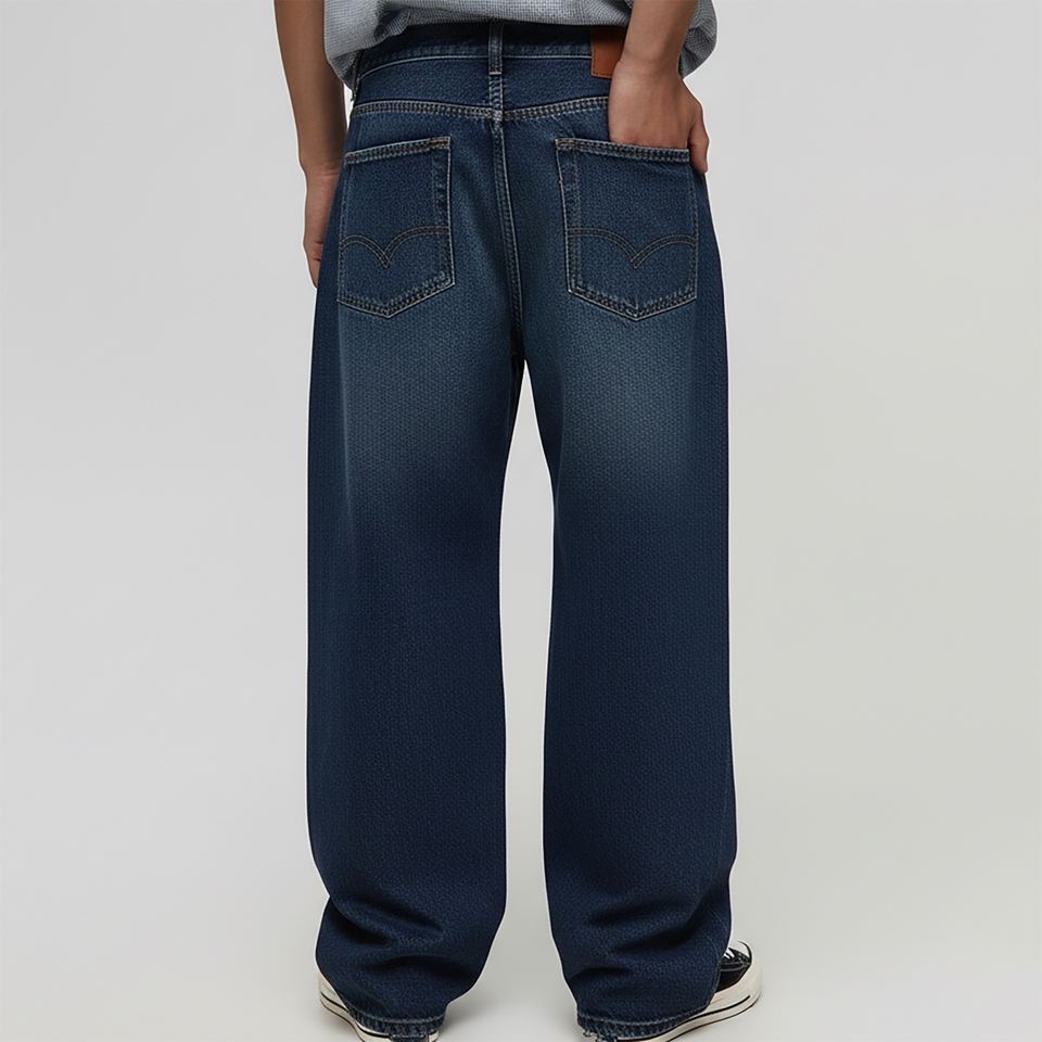 กางเกงยีนส์เดนิมสีน้ำเงินเข้มฟอกหินแบบยืดได้ ผลิตตามสั่ง OEM/ODM พร้อมปักโลโก้ตามแบบ สไตล์วินเทจ ทรงตรง สำหรับฤดูหนาว