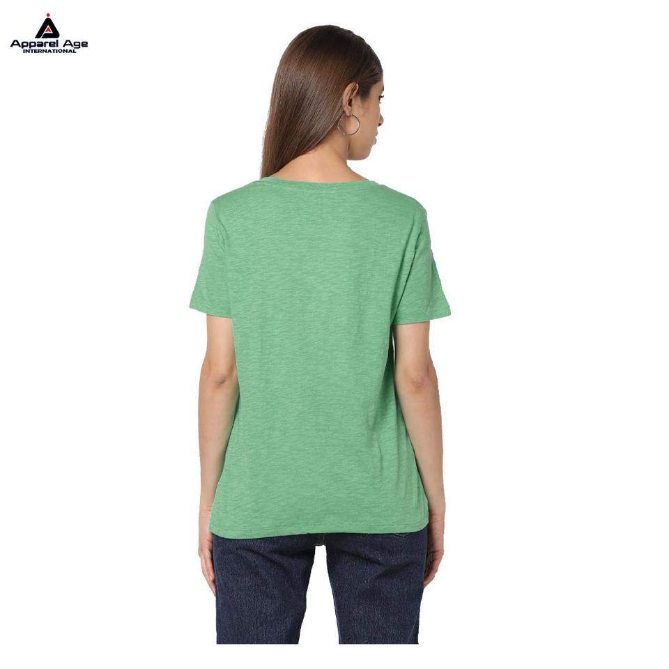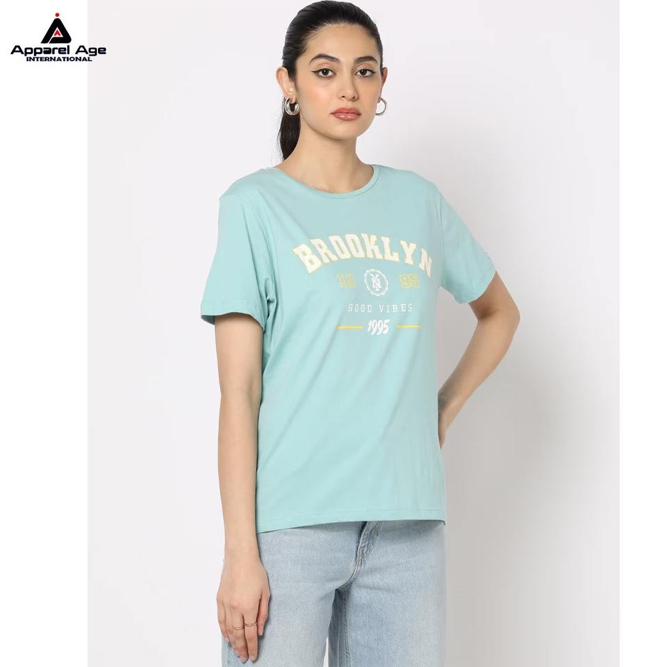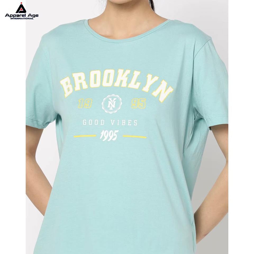เสื้อยืดผู้หญิงทรงเข้ารูป ผ้าคอตตอนผสมสแปนเด็กซ์ หนัก 100% พิมพ์ลายโลโก้ด้วยเทคนิคซิลค์สกรีน รับผลิตแบบ OEM/ODM ไซส์พลัส เป็นมิตรต่อสิ่งแวดล้อม
