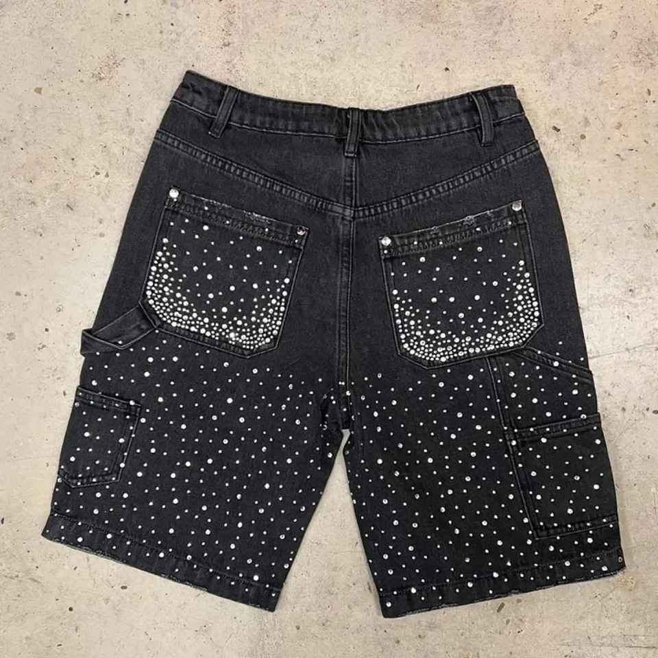 กางเกงขาสั้นผ้าเดนิมสำหรับผู้ชายแบบวินเทจผ้าคอตตอน100% กางเกงขาสั้นสไตล์สตรีทผ้าแห้งเร็วระบายอากาศได้ดีประดับพลอยเทียม