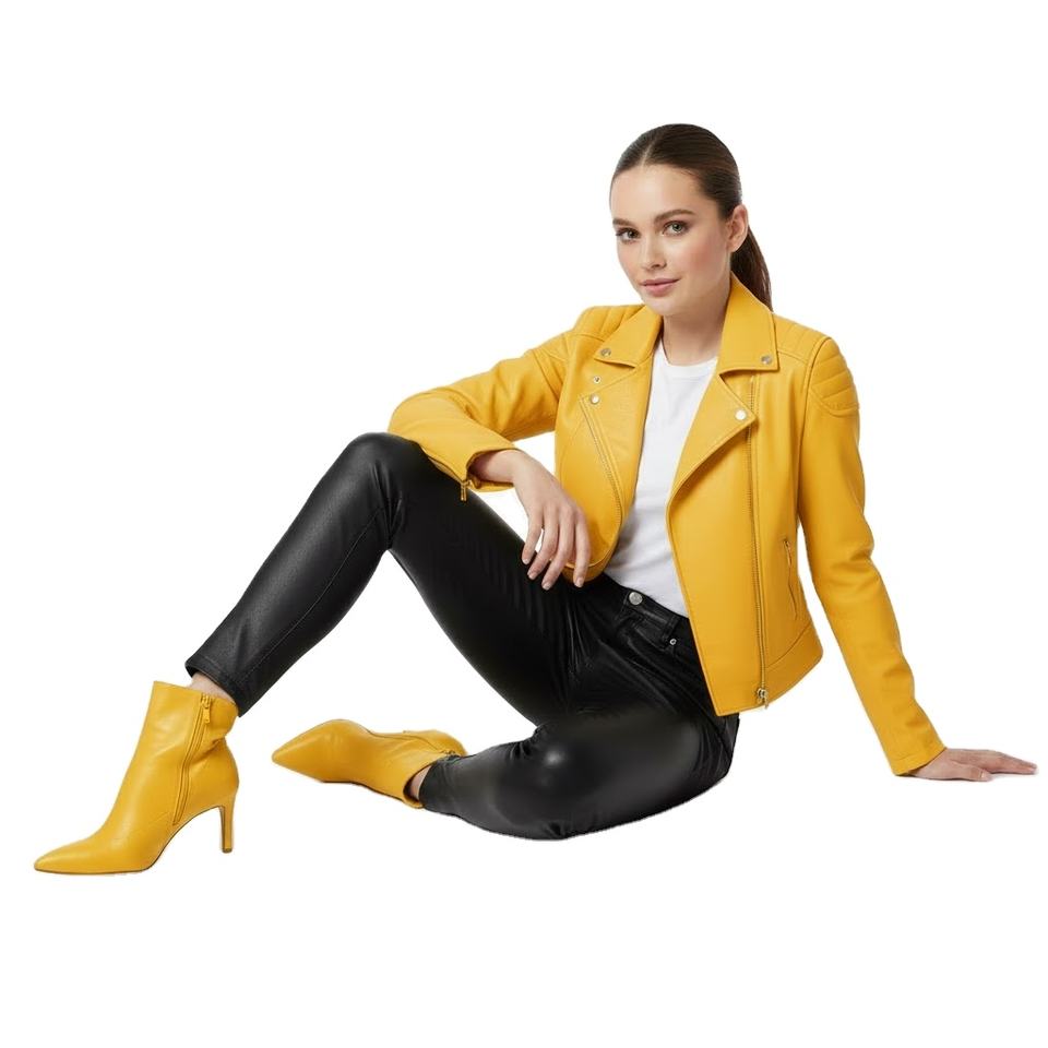 แจ็คเก็ตหนังแท้สีเหลืองสำหรับผู้หญิง สไตล์นักขี่มอเตอร์ไซค์ ผลิตตามแบบ OEM ODM รับผลิตตามสั่ง ขายส่งจำนวนมาก ราคาโรงงาน แฟชั่นสำหรับผู้หญิง