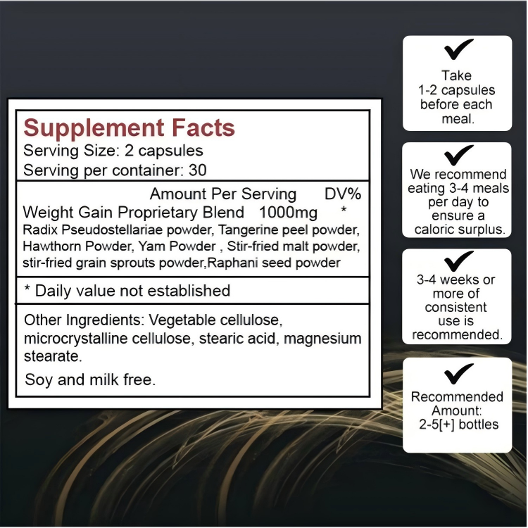 แคปซูลเพิ่มน้ำหนักสำหรับผู้ใหญ่ สูตรเฉพาะ OEM/ODM สารสกัดจากตองกัต ช่วยเสริมภูมิคุ้มกัน 60 แคปซูล แบรนด์ส่วนตัวเพื่อสุขภาพ