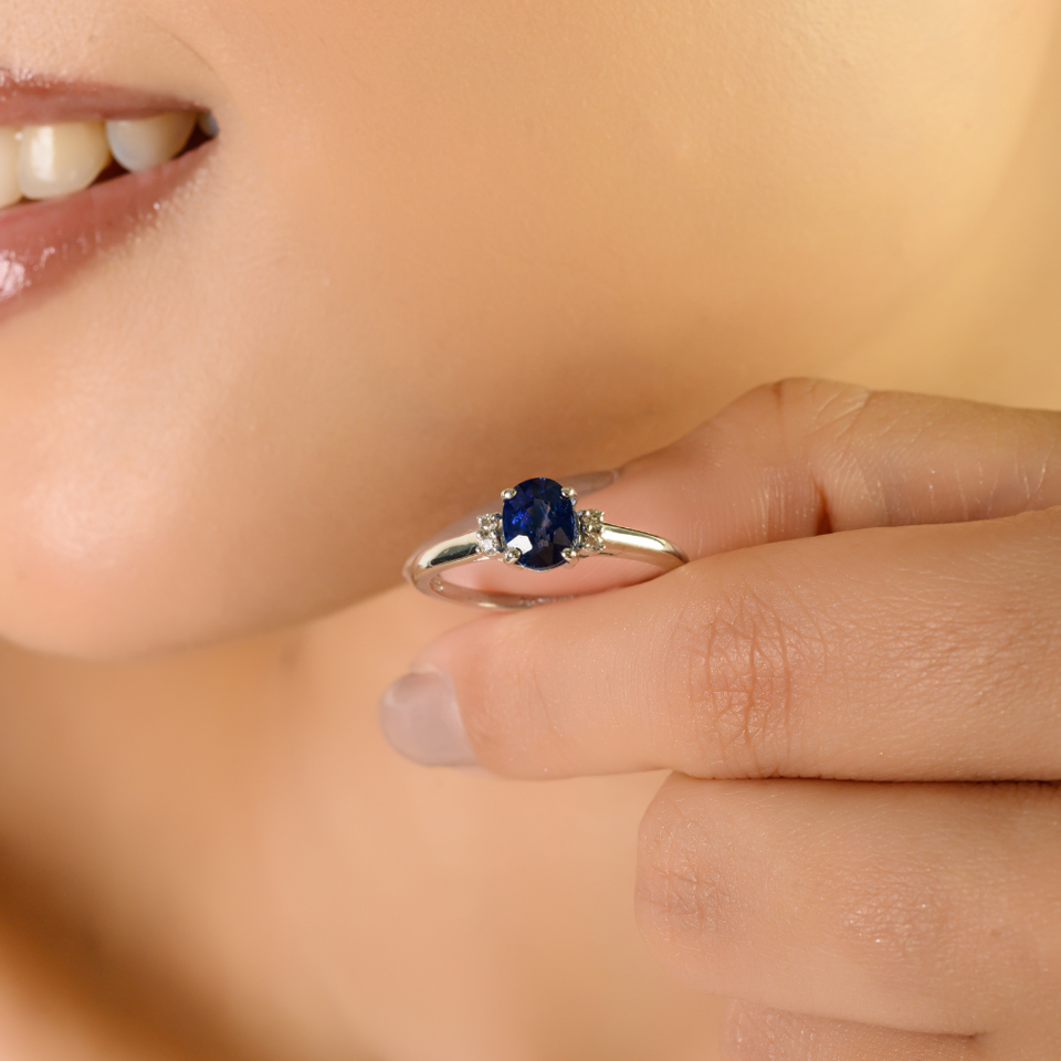 แหวนทองคำขาว K14 ประดับพลอยไพลินสีน้ำเงินและเพชร ดีไซน์เรียบหรู แบบซ้อนได้ สั่งทำได้ตามต้องการ (OEM/ODM) สำหรับสวมใส่ทุกวัน ขายส่งเครื่องประดับ