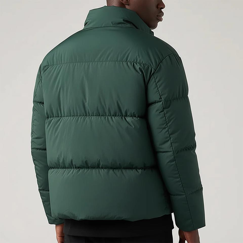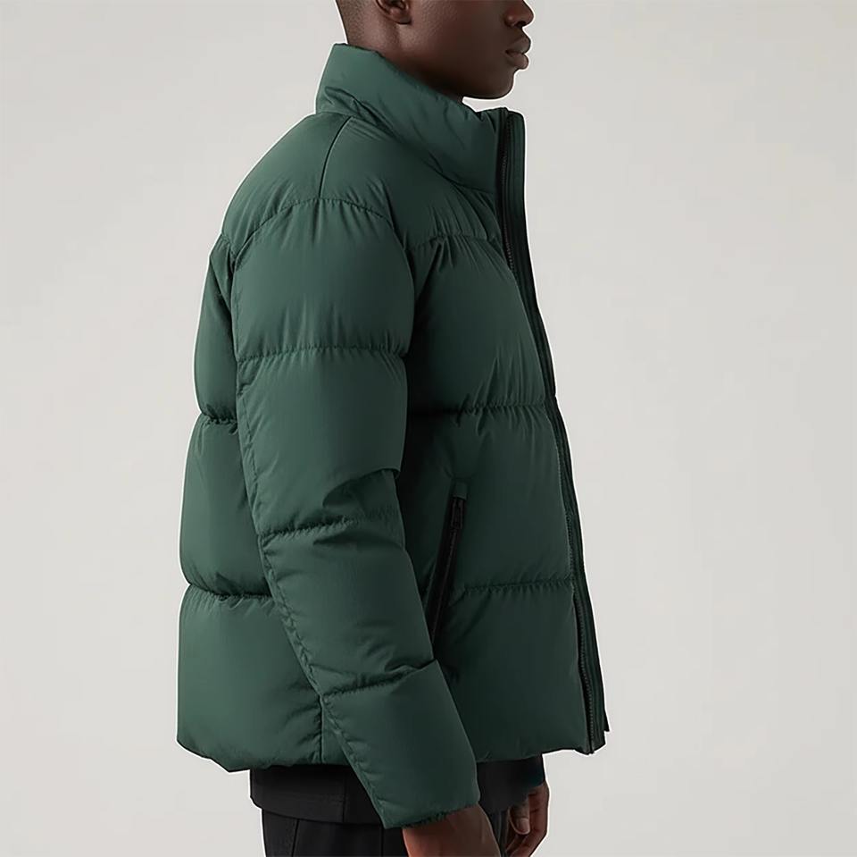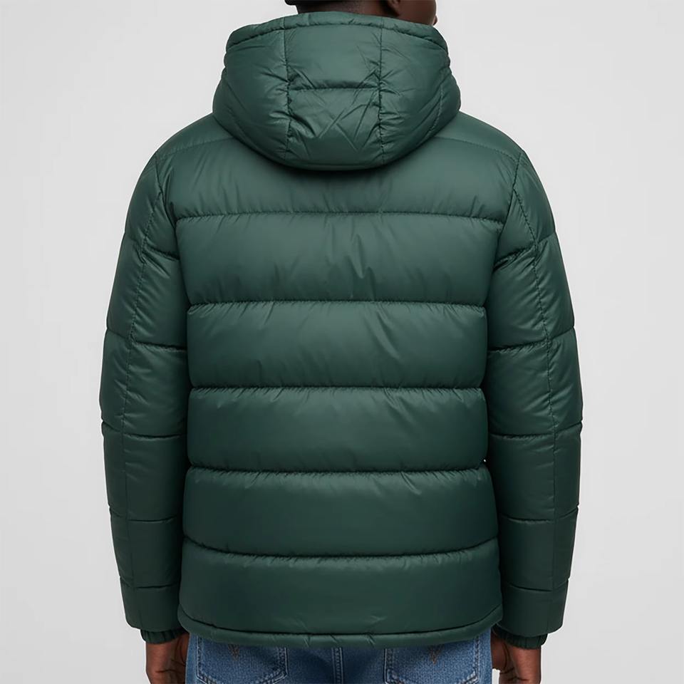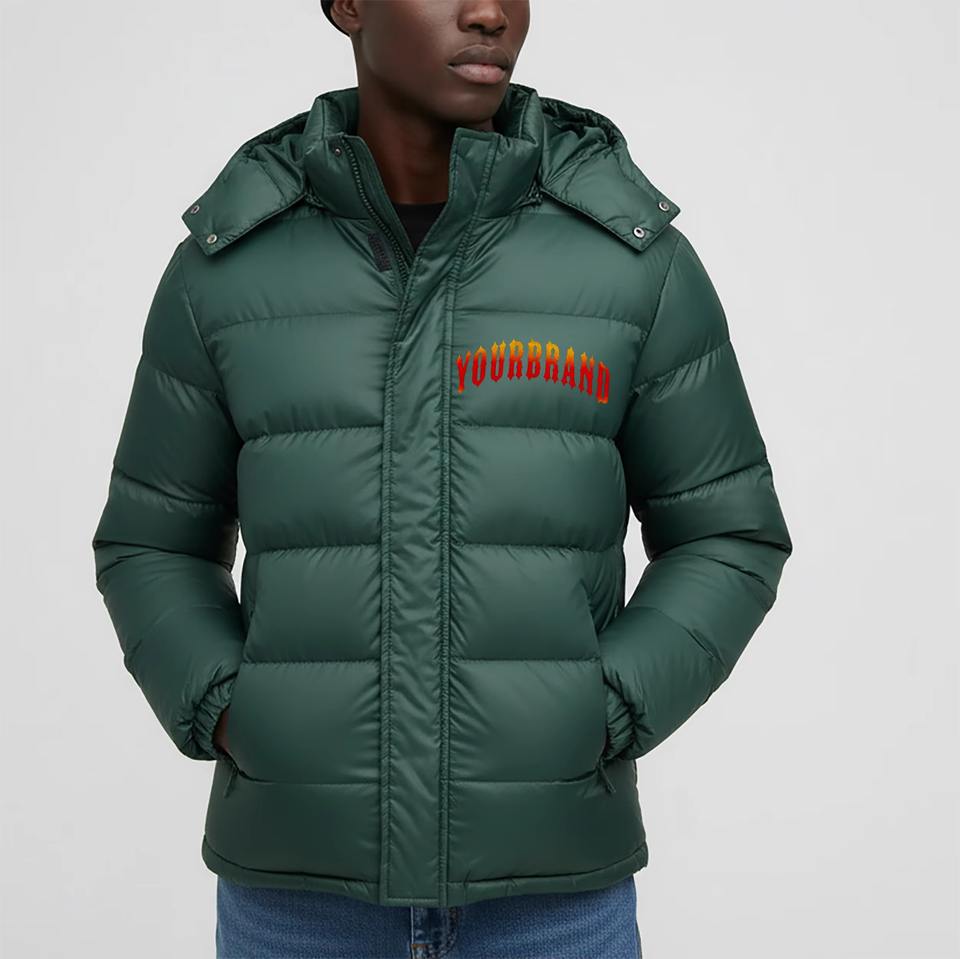 เสื้อแจ็คเก็ตขนห่านแบบ OEM ODM สั่งทำได้ตามต้องการ เสื้อโค้ทกันหนาวแบบพองตัวมีฮู้ด เงางาม ไซส์ใหญ่ ซิปและกระดุม บรรจุภัณฑ์แบบดรัม สำหรับผู้ชาย
