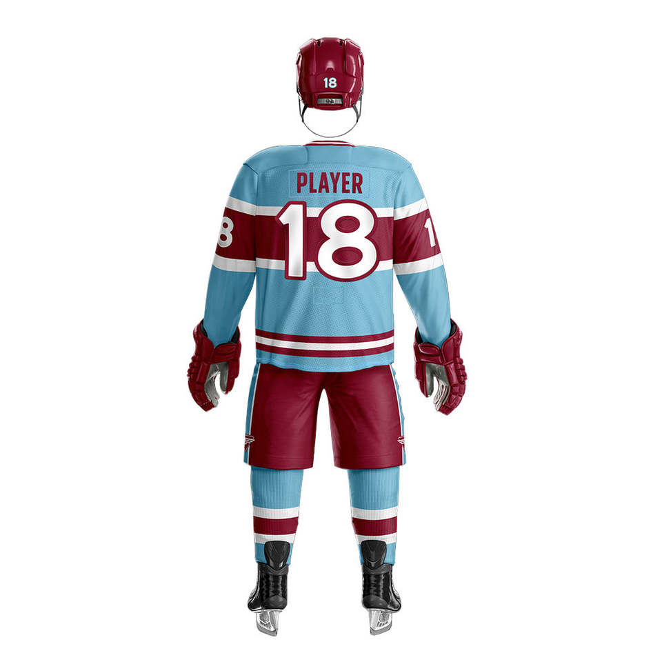 ชุดฮ็อกกี้น้ำแข็งสำหรับผู้ชายชุดฮ็อกกี้น้ำแข็ง100% ชุดกีฬาโพลีเอสเตอร์ขายดีพร้อมชื่อทีมออกแบบโลโก้ได้ตามต้องการ