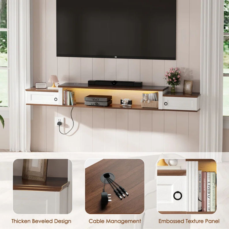 ชั้นวางทีวีแบบแขวนผนังสไตล์ฟาร์มเฮาส์ OEM ODM, ศูนย์รวมความบันเทิงไม้, ชั้นวางทีวีติดผนังพร้อมไฟและแท่นชาร์จ