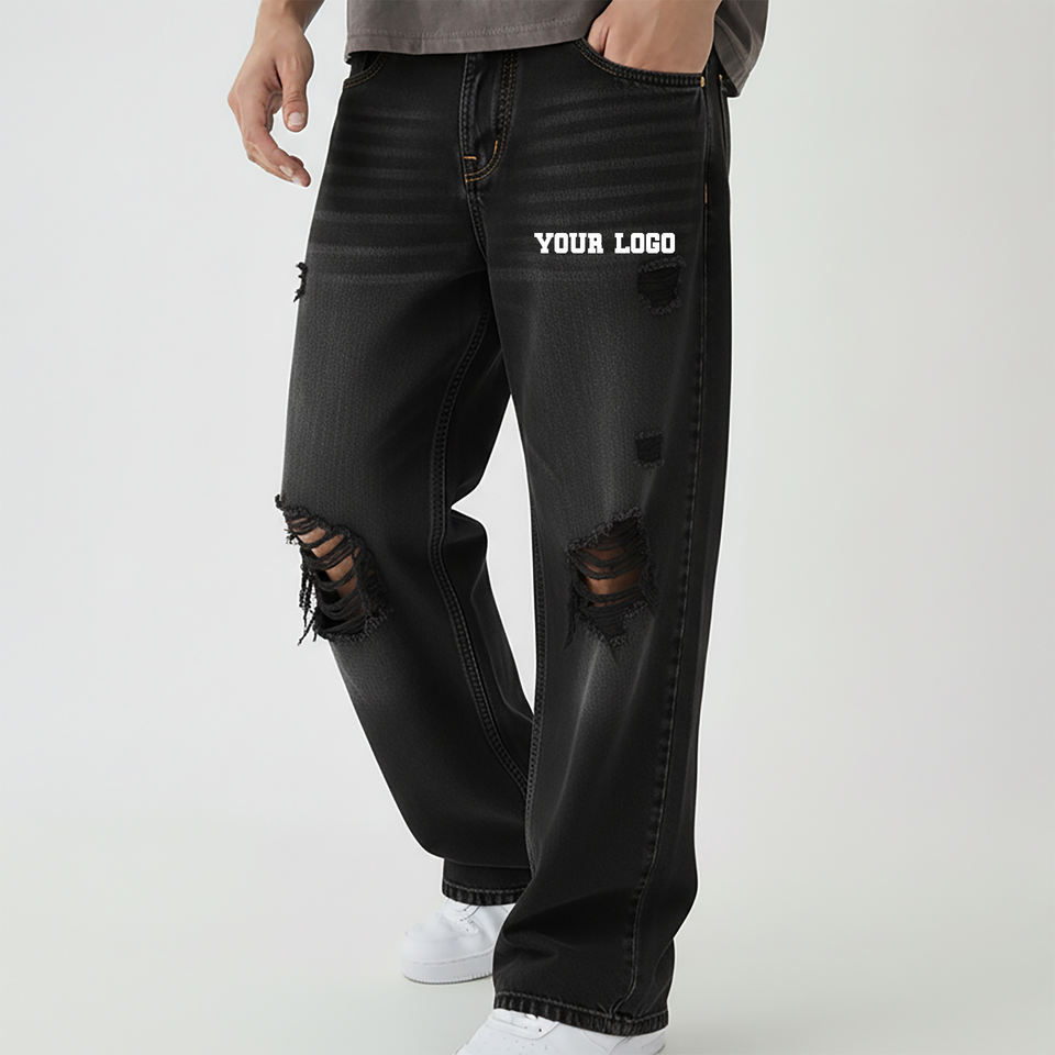 กางเกงยีนส์ขากว้างสีดำวินเทจคุณภาพสูงแบบ OEM/ODM สำหรับผู้ชาย ปักโลโก้ตามสั่ง ขาดๆ แบบหนา