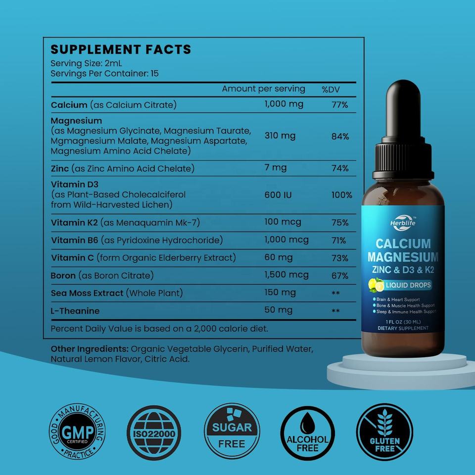 อาหารเสริมบำรุงกระดูกและหัวใจ OEM ODM ยอดขายดี แคลเซียม แมกนีเซียม ซิงค์ ชนิดหยด พร้อมวิตามินซี ดี3 เค2