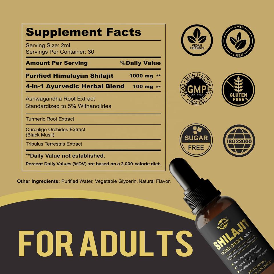 OEM ODM ผลิตภัณฑ์เสริมอาหารชิลลาจิตคอมเพล็กซ์ยอดนิยม ชิลลาจิตเรซินเหลวจากเทือกเขาหิมาลัย ผสมอัชวากันธาและขมิ้น