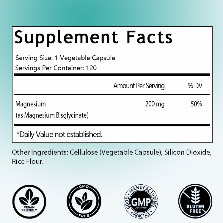 แคปซูลแมกนีเซียมบิสไกลซิเนต 200 มก. ยอดขายดีแบบ OEM/ODM อาหารเสริมแมกนีเซียม ช่วยการนอนหลับ บรรเทาอาการปวดกล้ามเนื้อ และปรับอารมณ์