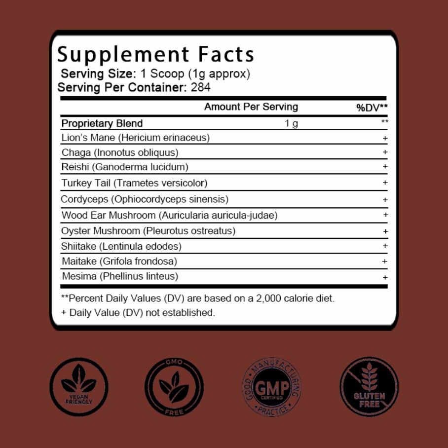 OEM/ODM Hotselling Organic Mushroom Powder, 10 in 1 Complex Formula for Immune System Booster, Chaga, Lions Mane