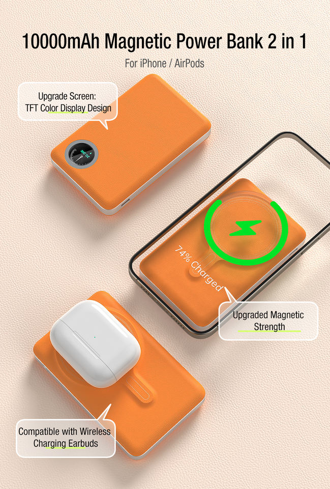 OEM ODM พาวเวอร์แบงค์แม่เหล็ก 2 in 1 พร้อมแบตเตอรี่กึ่งโซลิดสเตต พาวเวอร์แบงค์หนังพร้อมหน้าจอ TFT สำหรับโทรศัพท์มือถือและ Airpods
