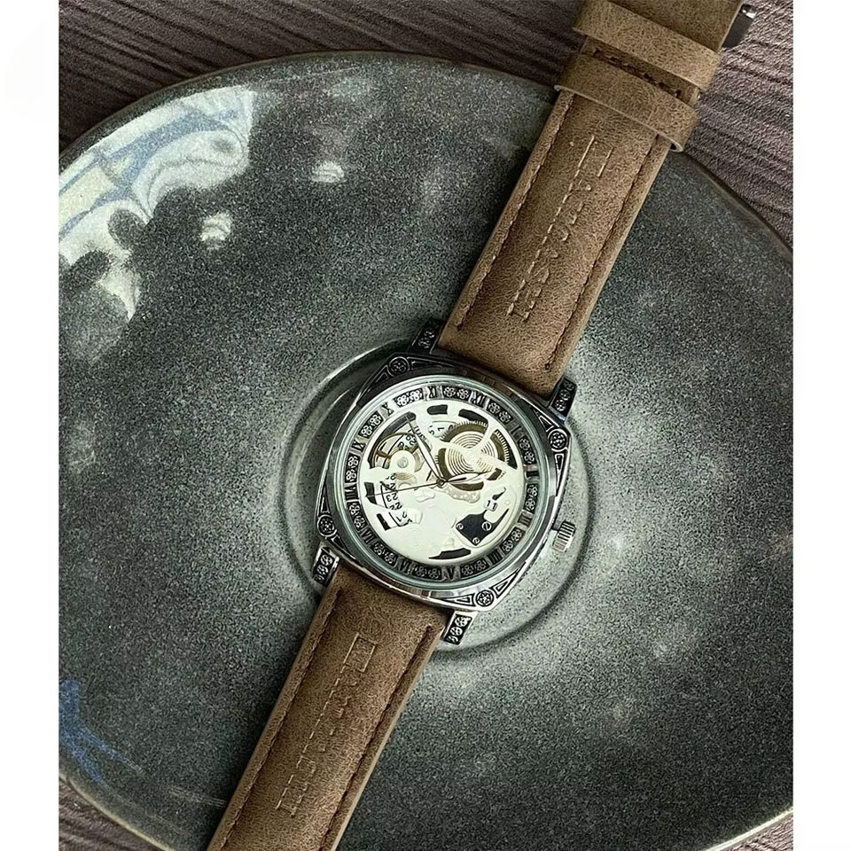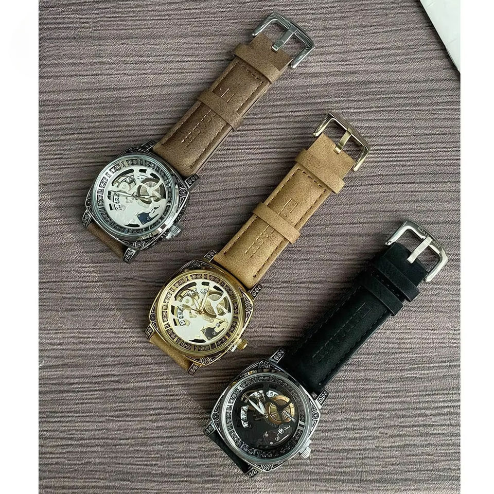 OEM ODM Men's Retro Golden Square Mechanical Watch Luminous Skeleton Design Engraved Case Yellow Gold Power Reserve Customizable