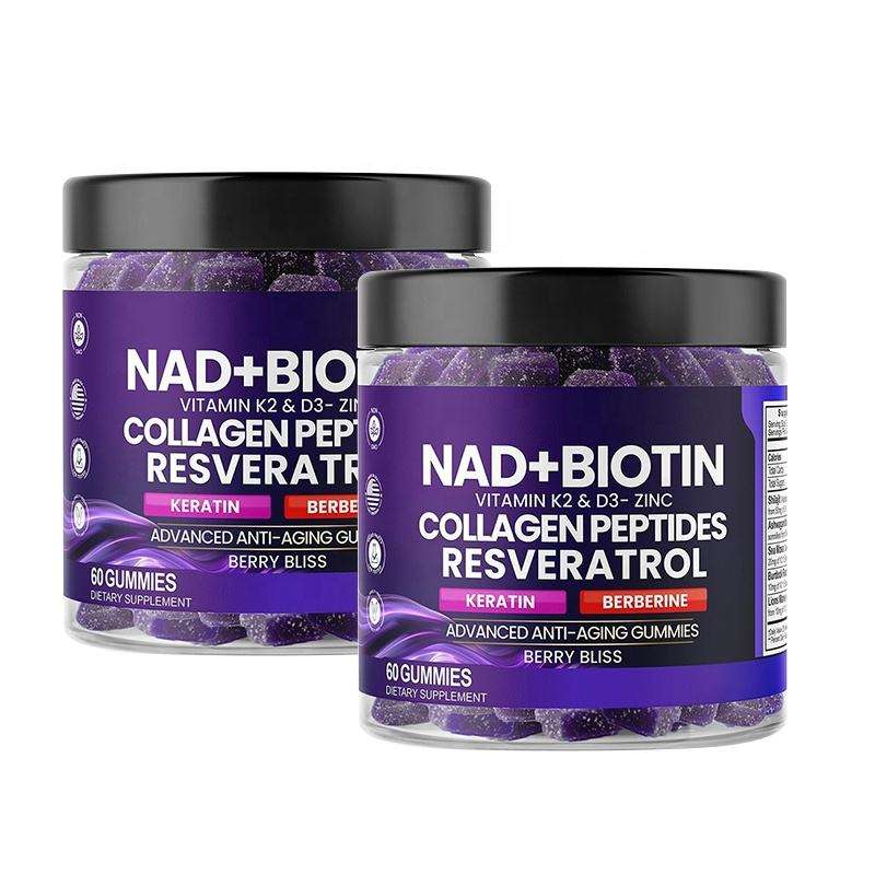 OEM ODM NAD+ เรสเวอราทรอล เบอร์เบอรีน ไบโอติน แอนตี้เอจจิ้ง คอลลาเจน เคอราติน ซิงค์ วิตามิน K2 D3 วิตามินสำหรับผู้ใหญ่ชนิดกัมมี่ บำรุงผม ผิว เล็บ ข้อต่อ