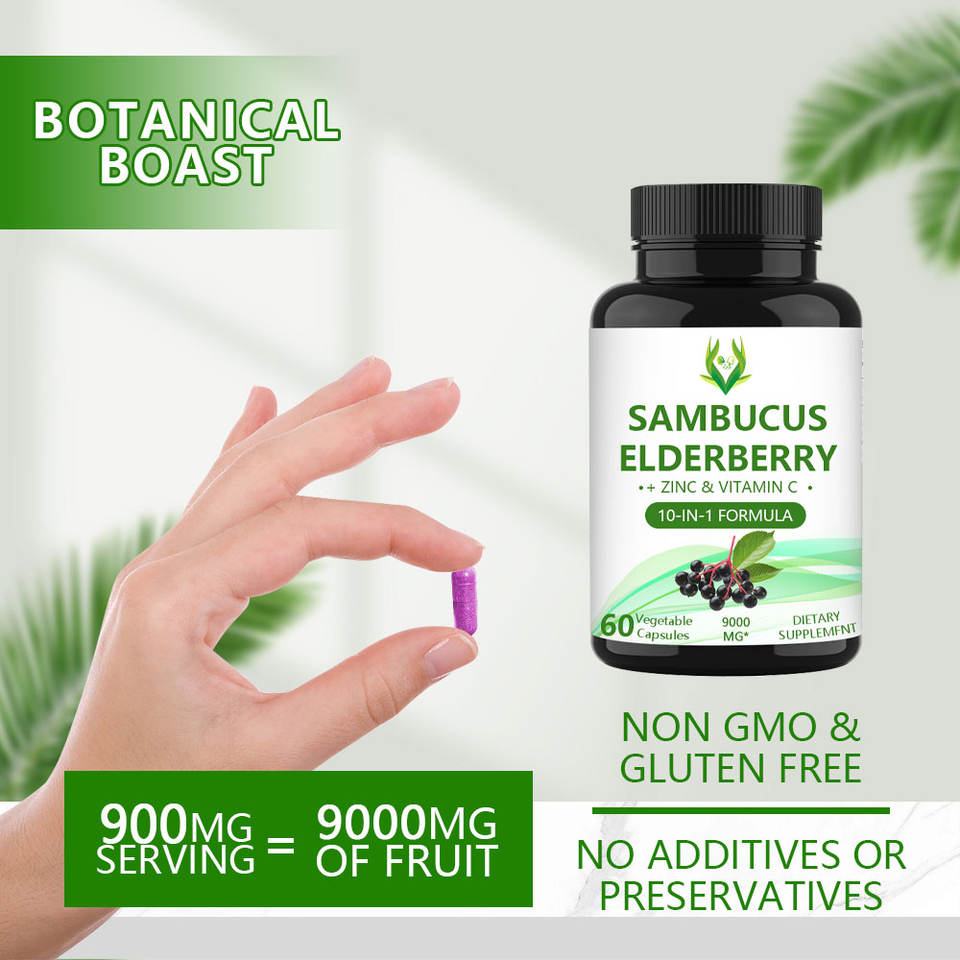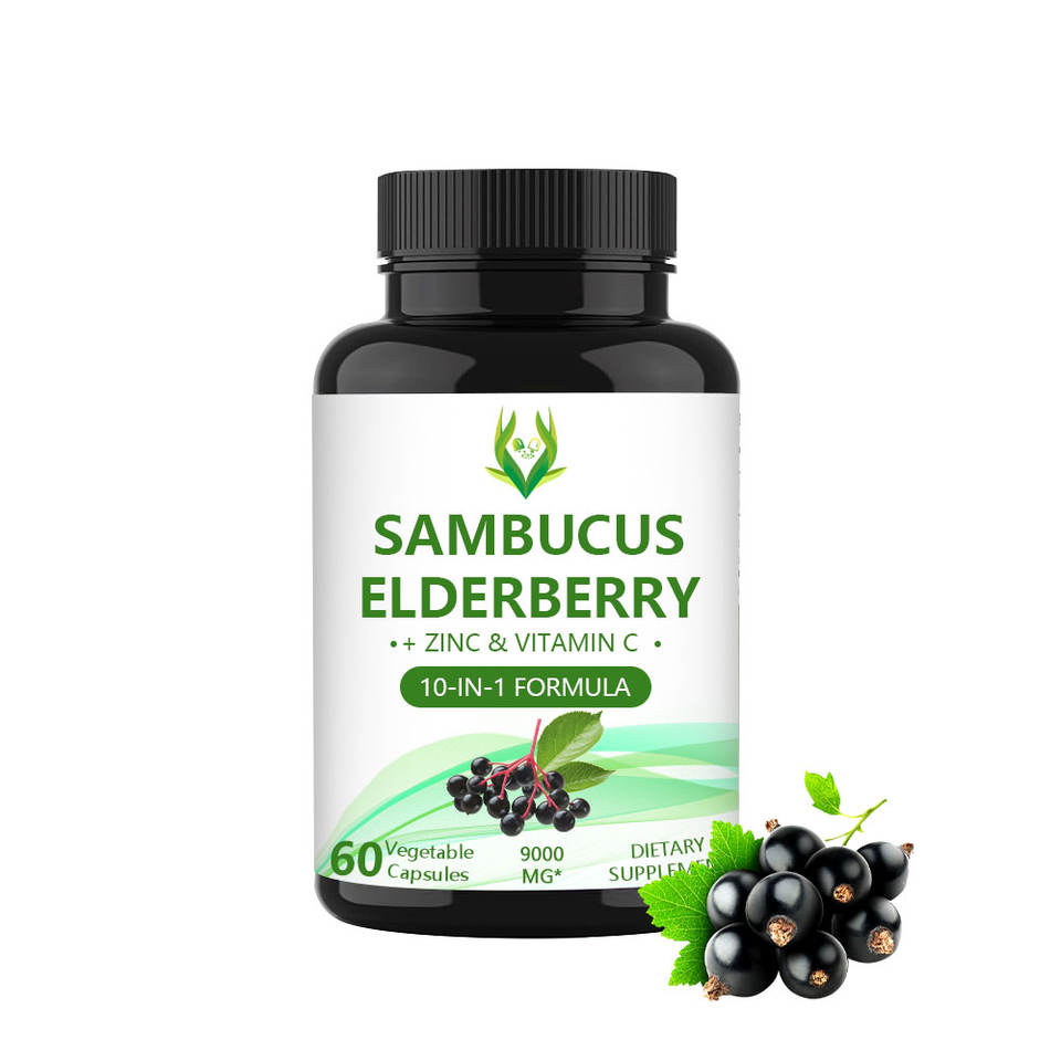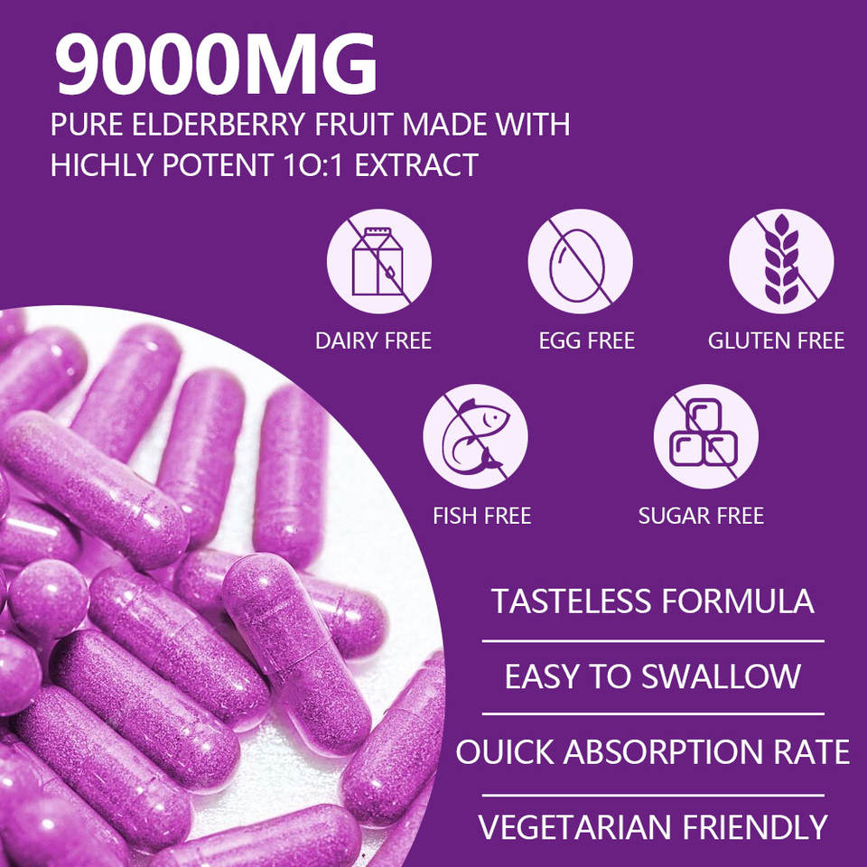 แคปซูลซัมบูคัส เอลเดอร์เบอร์รี่ ออร์แกนิค OEM ODM 9000 มก. วิตามินซี ซิงค์ เสริมภูมิคุ้มกันสำหรับผู้ใหญ่ บำรุงภูมิคุ้มกันและควบคุมพลังงาน