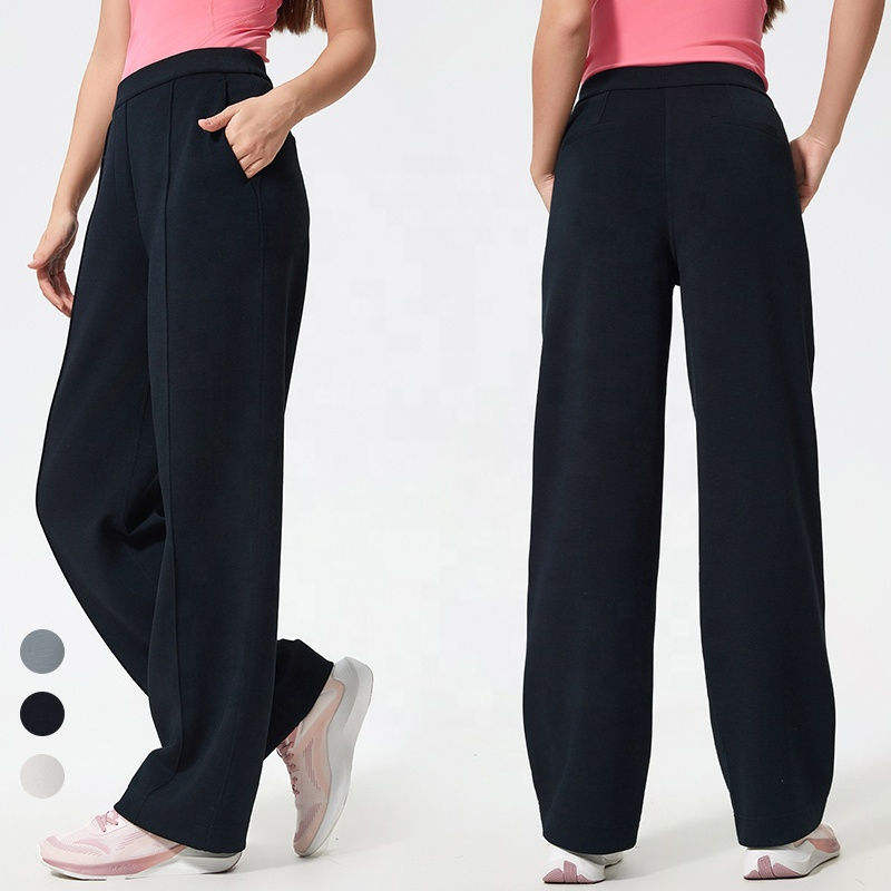 ผู้ผลิตกางเกง OEM ODM กางเกงลำลองขาบานสำหรับผู้หญิง กางเกงออกกำลังกายเอวยางยืด กางเกงทรงตรงแบบมีกระเป๋า