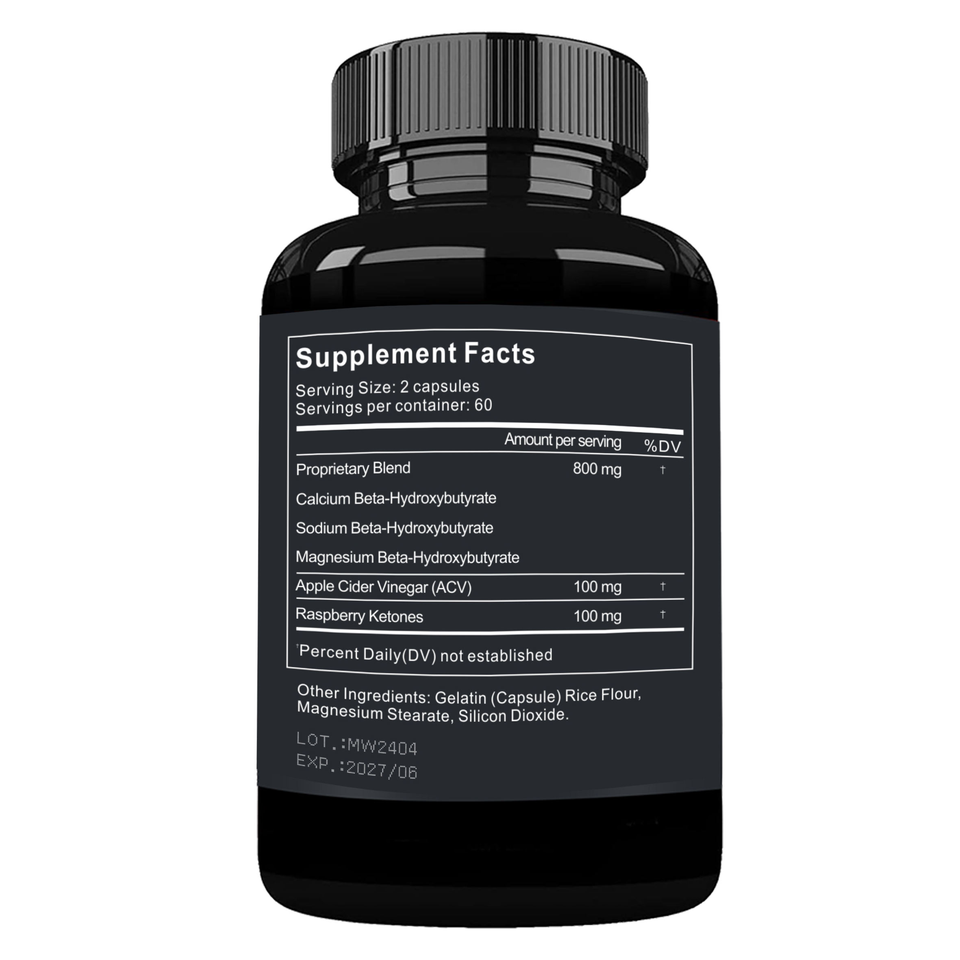 Calcium Beta-Hydroxybutyrate, Sodium Beta-Hydroxybutyrate, Magnesium Beta-Hydroxybutyrate, Apple Cider Vinegar (ACV)100 mg, Raspberry Ketones 100 mg