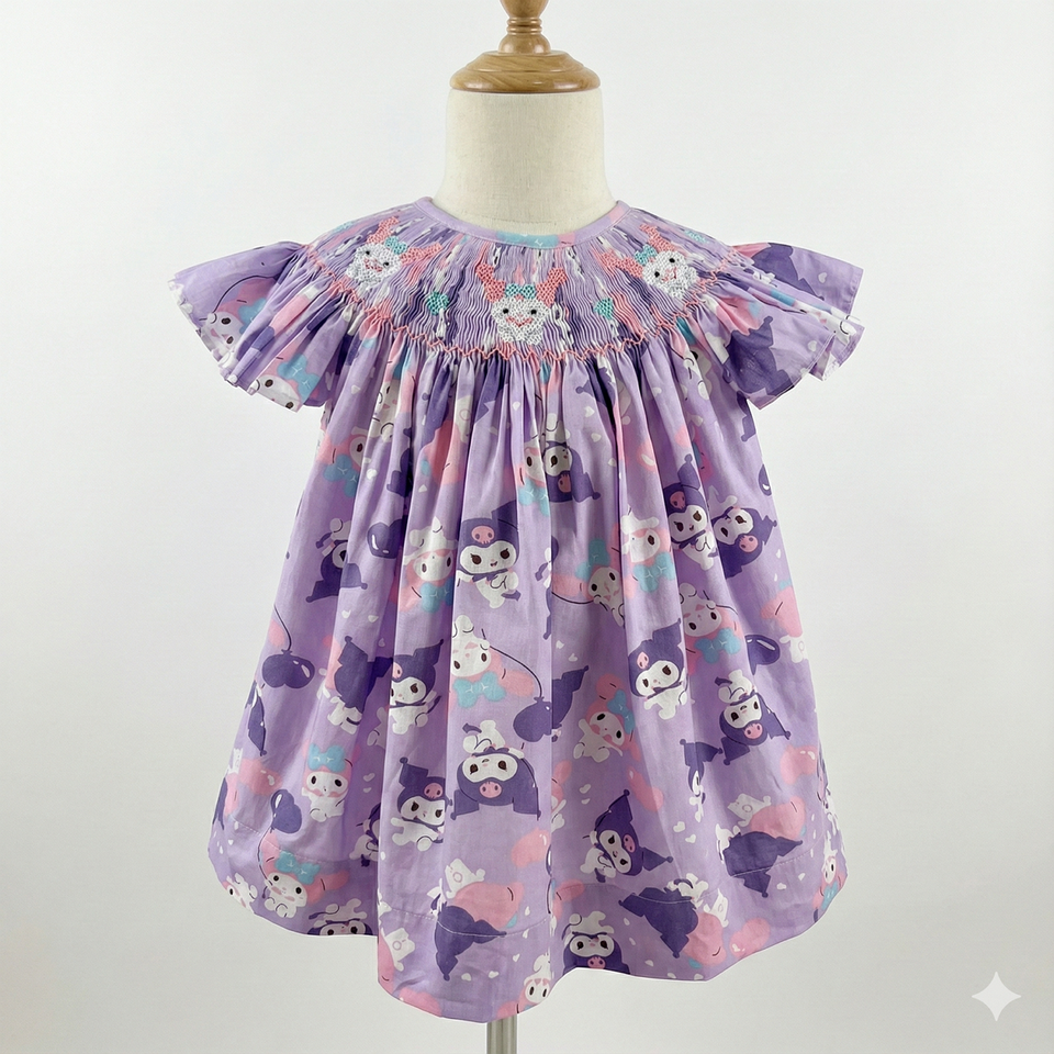 บริการ OEM ODM ชุดเดรสเด็กผู้หญิงผ้าฝ้ายเนื้อนุ่มระบายอากาศได้ดี คุณภาพสูง สีม่วง พิมพ์ลายการ์ตูน แต่งระบายมือ