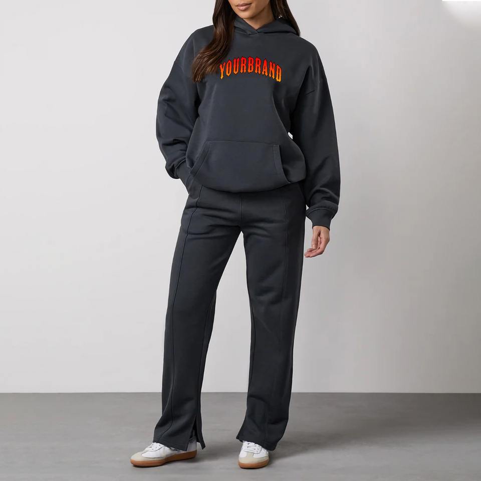 ชุดออกกำลังกายฤดูหนาวสำหรับผู้หญิง OEM ODM แบบ 2 ชิ้น ชุดเซ็ตเสื้อฮู้ดแขนยาวผ้าฝ้ายพร้อมสกรีนพิมพ์ลายปักแบบกำหนดเอง
