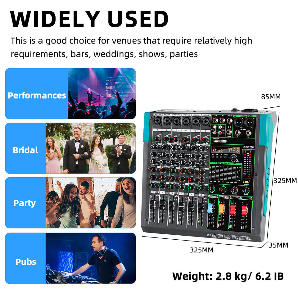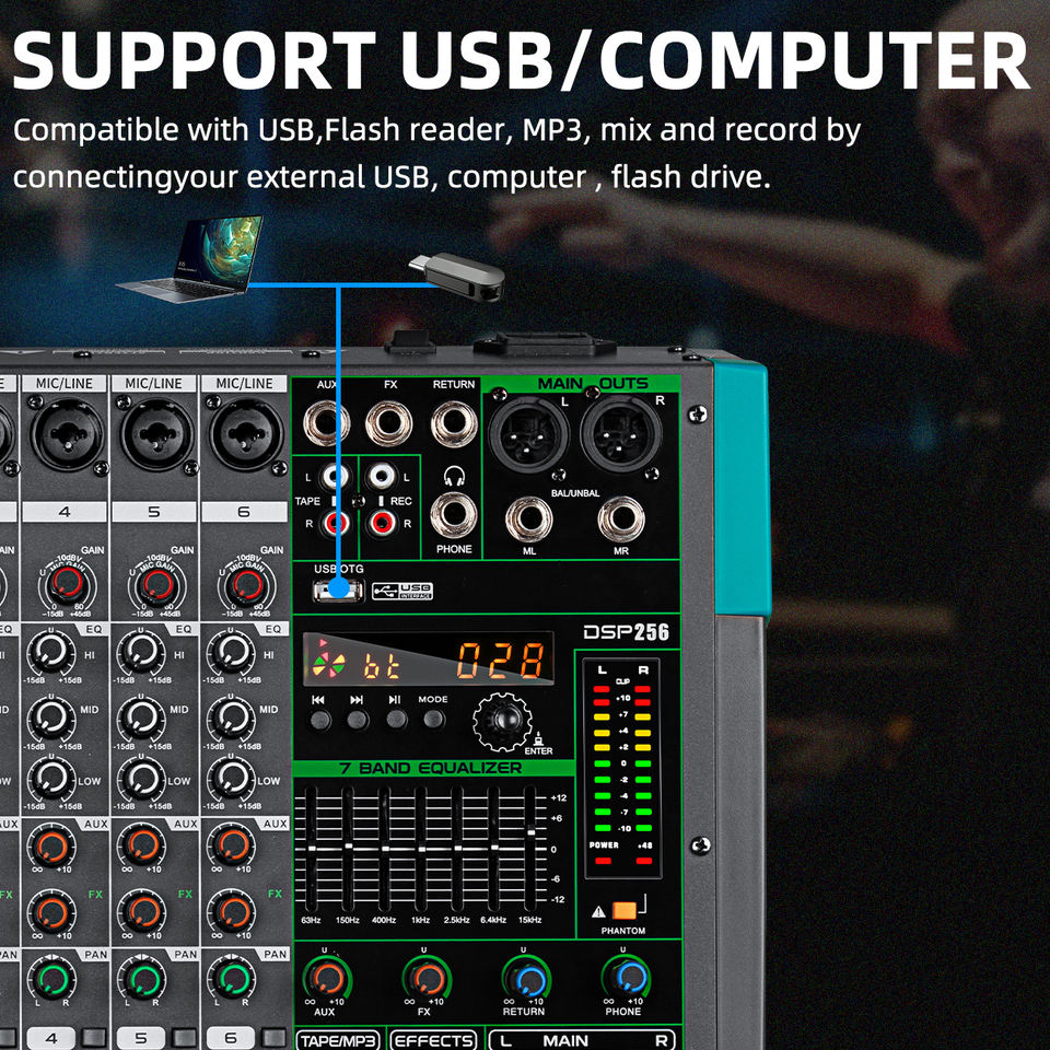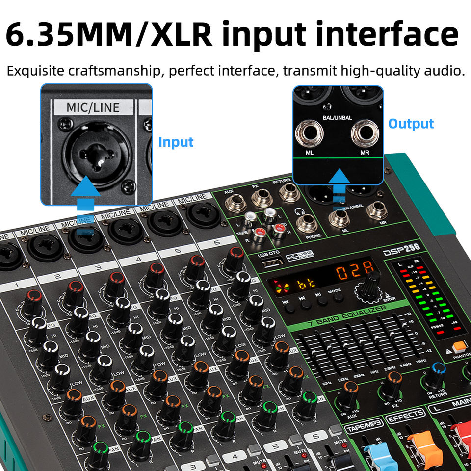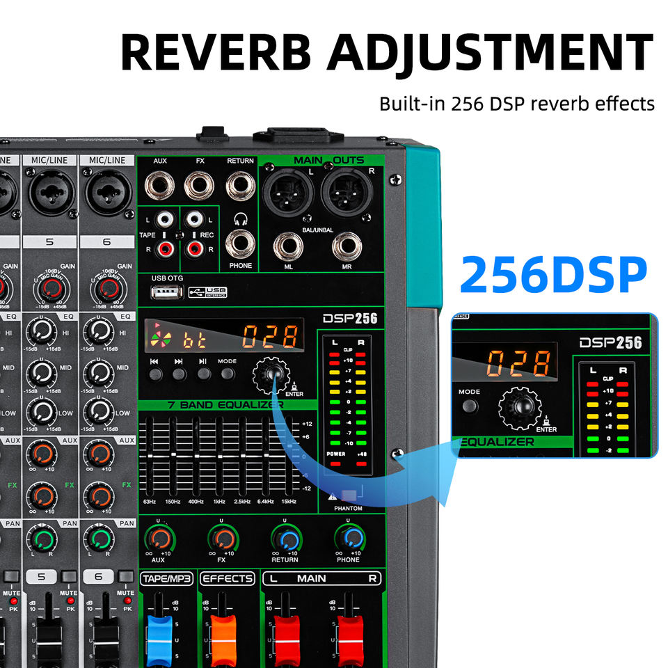 มิกเซอร์คอนโซล USB 6 แชนแนล OEM PA6 ระดับมืออาชีพ พร้อมเอฟเฟกต์เสียงก้องในตัว 256 แบบ มิกเซอร์เสียงระดับมืออาชีพ