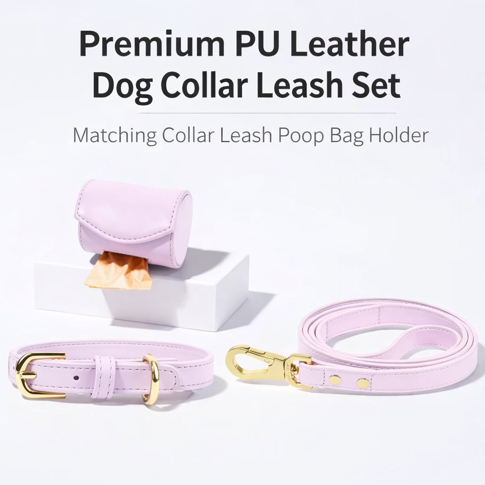 ชุดสายจูงสุนัขหนัง PU แบบ OEM พร้อมปลอกคอ สายจูง และที่ใส่ถุงเก็บอุจจาระ สีและโลโก้สั่งทำได้ สำหรับสุนัขขนาดเล็กถึงกลาง