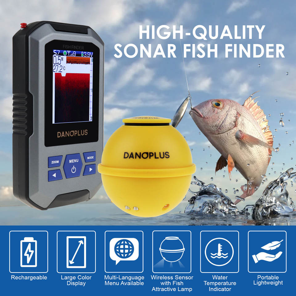 มีบรรจุภัณฑ์ OEM ให้เลือก - เครื่องหาปลาแบบไร้สายพร้อมเซ็นเซอร์โซนาร์ ระยะตรวจจับ 45 เมตร (147 ฟุต) / 0.7 เมตร (2 ฟุต) พร้อมหน้าจอ LCD