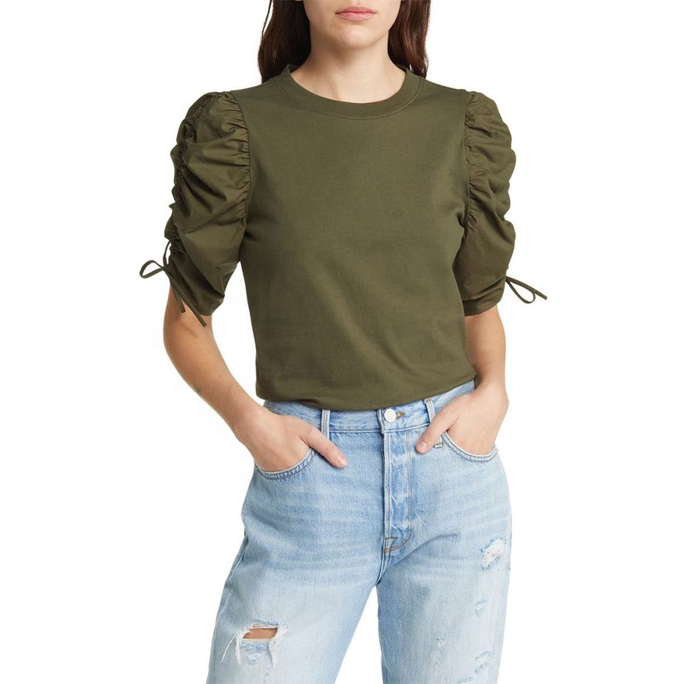 เสื้อยืดสีเขียวสำหรับสุภาพสตรี,เสื้อยืดแขนสามส่วนทำจาก JANEEQ S.co ผ้านุ่มสไตล์เรียบง่าย