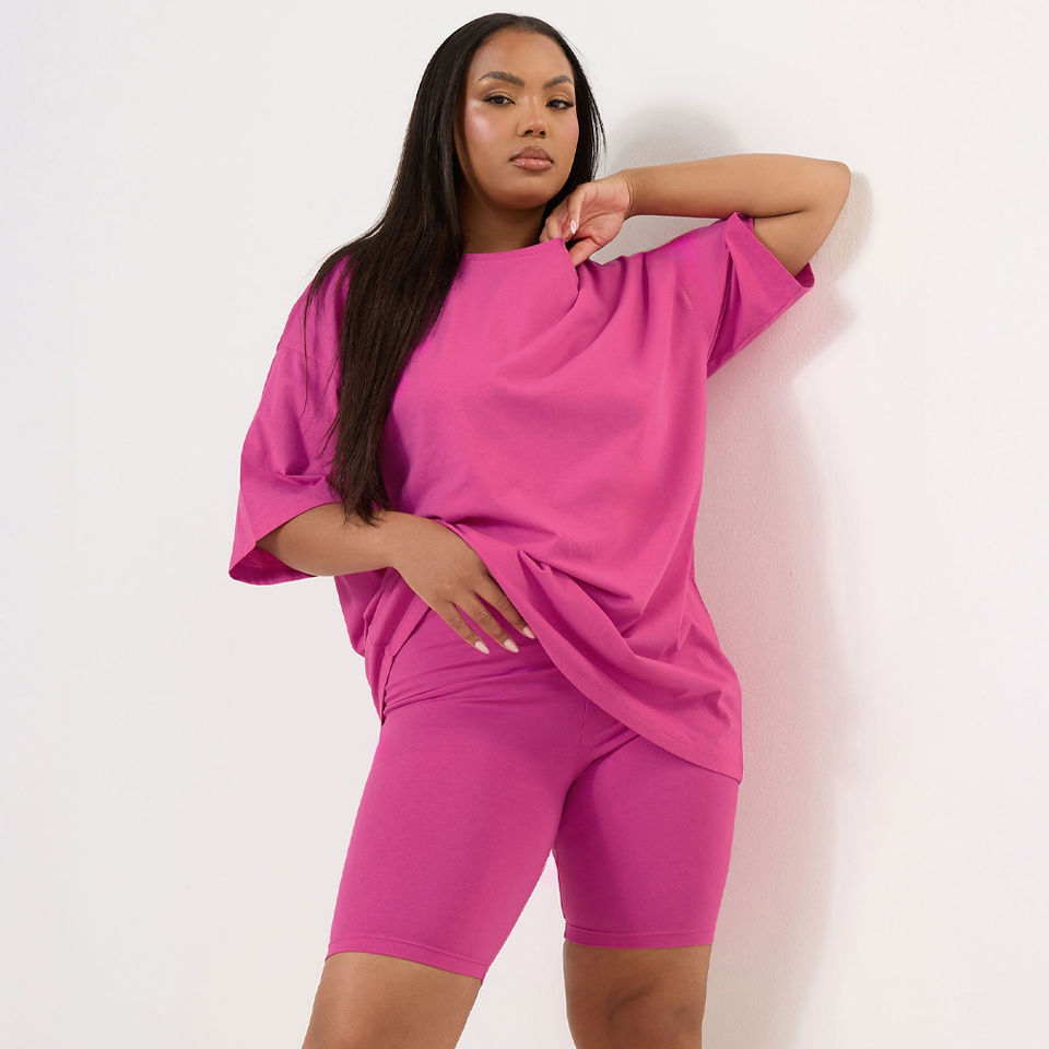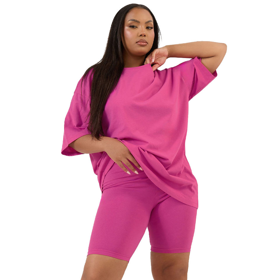 ชุดเซ็ตเสื้อยืดโอเวอร์ไซส์และกางเกงขาสั้นทรง Biker สำหรับผู้หญิงไซส์ใหญ่ OEM ผ้าฝ้ายลำลองใส่สบาย