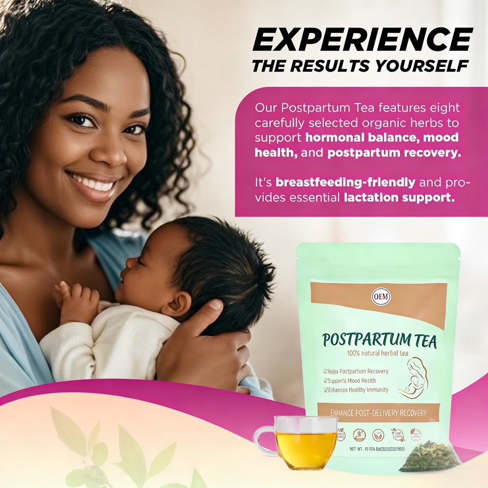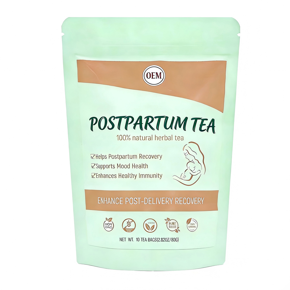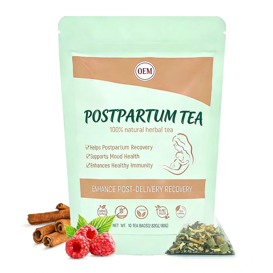 ชาสมุนไพรออร์แกนิกสำหรับฟื้นฟูหลังคลอด OEM ผสมอัชวากันธา ราสเบอร์รี่ ขิง ตำแย 100% จากธรรมชาติ สำหรับคนทานวีแกน บรรจุ 10 ซองชา ซองละ 8 กรัม บรรจุกล่อง