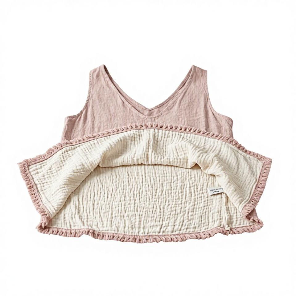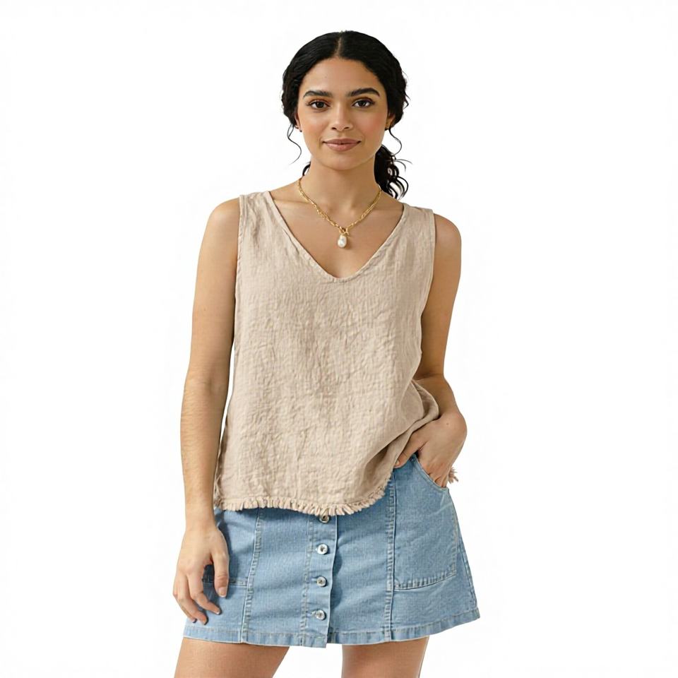 เสื้อกล้ามคอวีผ้าฝ้ายทอสำหรับผู้หญิงแบบพรีเมียม OEM ตกแต่งด้วยกระดุมและลูกปัด ซับในนุ่ม ระบายอากาศได้ดี เสื้อแขนกุดสำหรับฤดูร้อน ดีไซน์ด้านหน้า