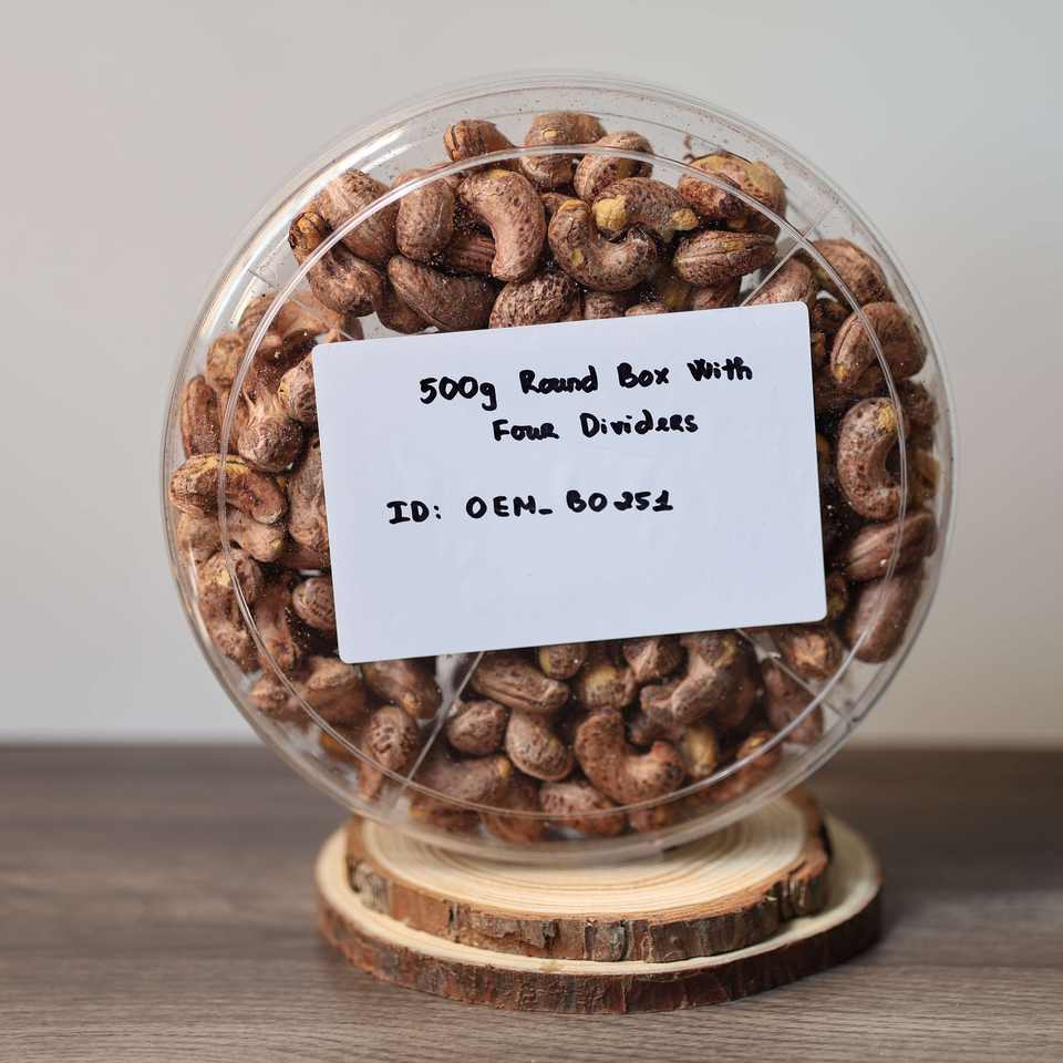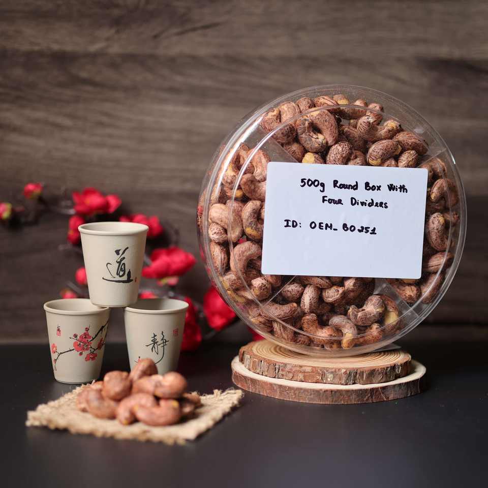 เมล็ดมะม่วงหิมพานต์คั่วพรีเมียม OEM บรรจุกล่องกลม 500 กรัม แบ่ง 4 ช่อง - ผลิตจากโรงงานโดยตรง รสเนยเค็ม ราคาสุดคุ้ม
