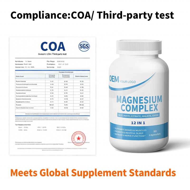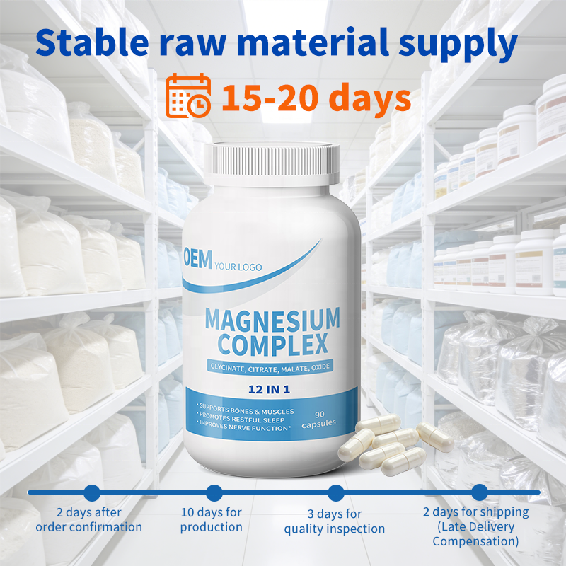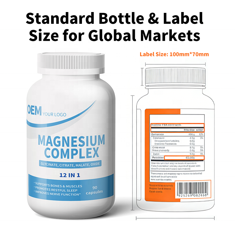แคปซูลแมกนีเซียมคอมเพล็กซ์ 12 in 1 แบรนด์ OEM ฉลากส่วนตัว ขนาดมาตรฐาน รองรับบาร์โค้ด จัดส่งเสถียร พร้อมใบรับรองคุณภาพจากผู้ตรวจสอบบุคคลที่สาม