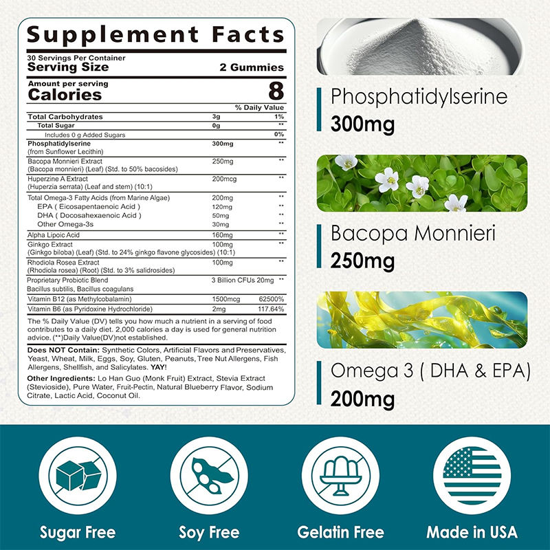 OEM ผลิตภัณฑ์เสริมอาหารฟอสฟาติดิลเซอรีน 300 มก. แบบกัมมี่ บำรุงสมอง ปราศจากน้ำตาล เสริมภูมิคุ้มกันสำหรับผู้ใหญ่