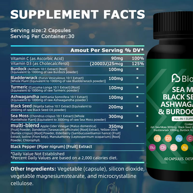 ส่วนผสมหลัก:sea moss, Black Seed Oil, Turmeric, Ashwagandha, Burdock