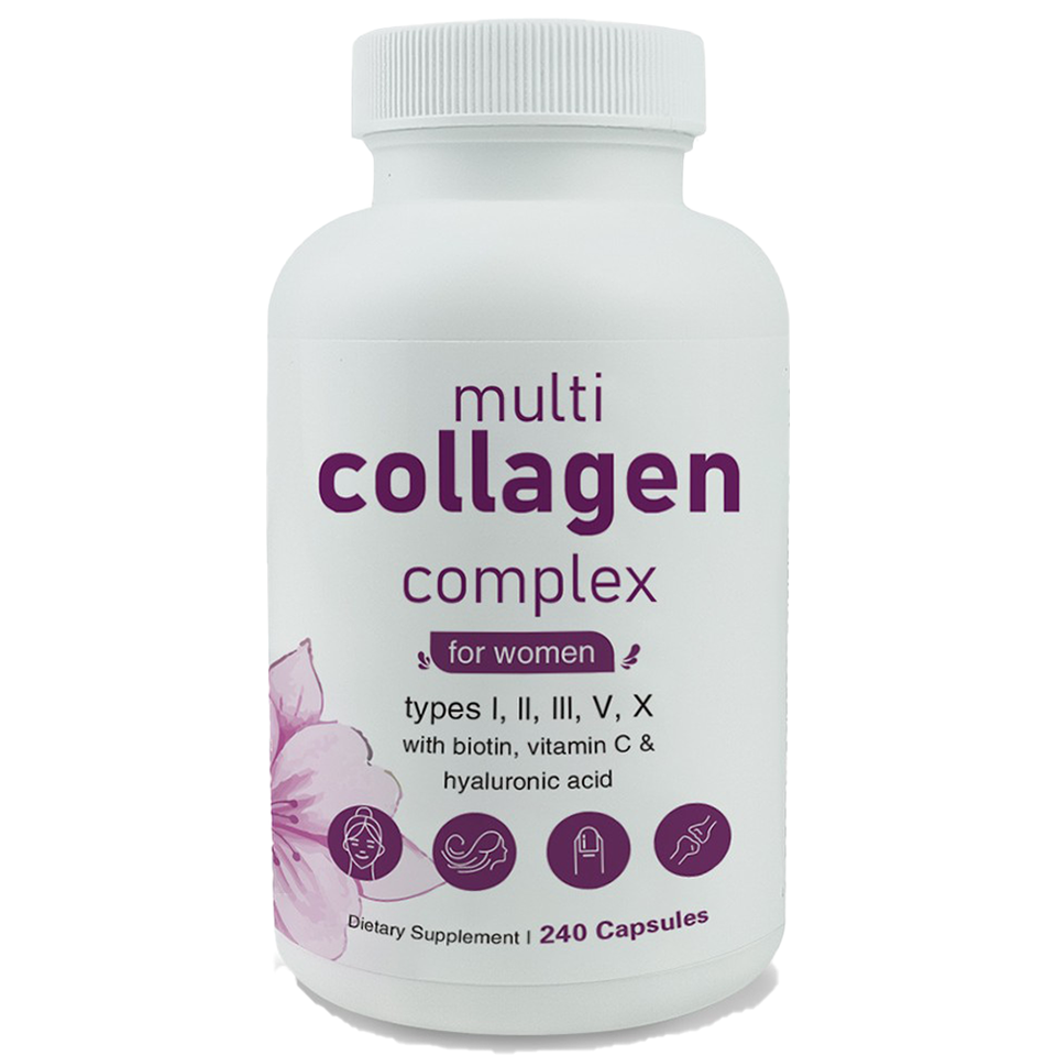 แคปซูลคอลลาเจนคุณภาพสูงสำหรับผู้หญิง แบรนด์ OEM/Private Label ช่วยให้ผิวกระจ่างใส และบำรุงผม/เล็บ 240 แคปซูล/ขวด