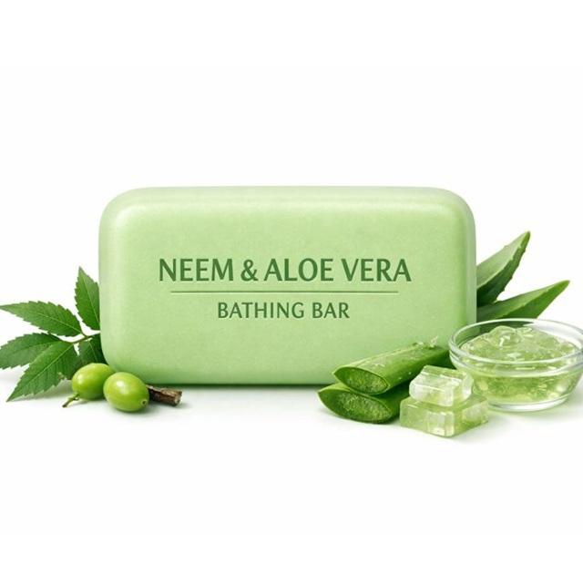 สบู่ก้อนสมุนไพรนีมและว่านหางจระเข้ ผลิตแบบ OEM สำหรับแบรนด์ส่วนตัว ขายส่ง สบู่สมุนไพรบำรุงผิวและต้านเชื้อแบคทีเรีย สบู่อาบน้ำแบบอายุรเวท