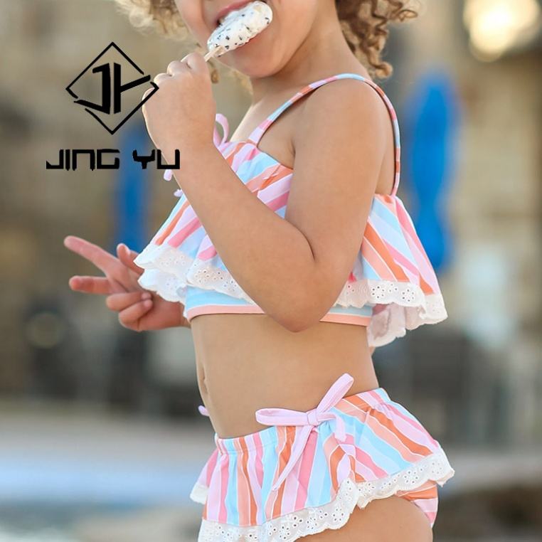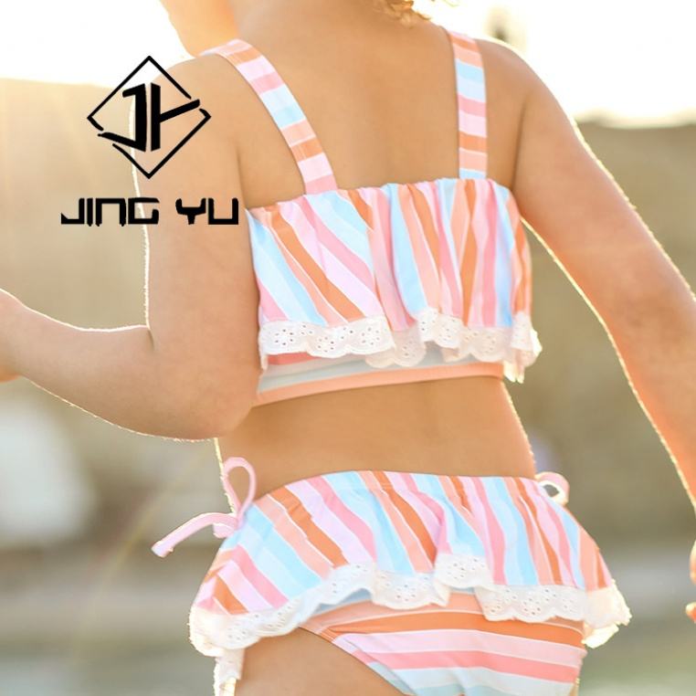 ชุดว่ายน้ำเด็กผู้หญิงสองชิ้นลายทางระบายชายแบบมืออาชีพจากโรงงานผู้ผลิต (OEM) คุณภาพสูง ทำจากไนลอน