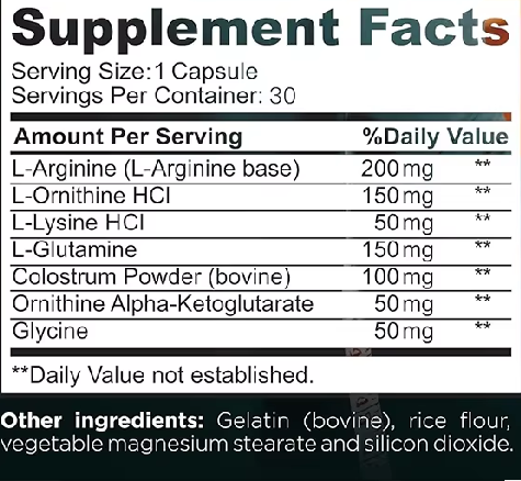 ส่วนผสมหลัก:L-arginine, L-ornithine, L-lysine, L-glutamine, ผง Colostrum (วัว)