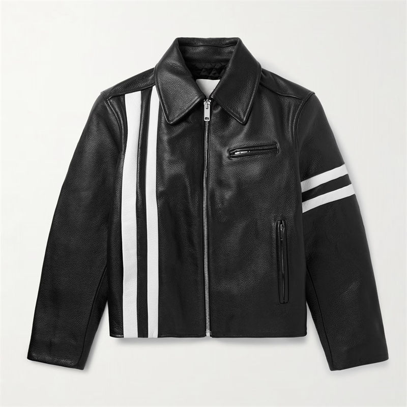 OEM เสื้อแจ็คเก็ตหนังแท้เข้ารูปสำหรับผู้ชาย, เสื้อแจ็คเก็ตหนังแท้สีดำมีแถบคาดที่น่าสนใจสำหรับใส่ในฤดูหนาว