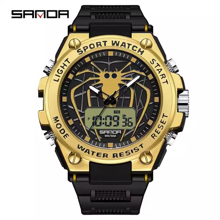 OEM SANDA 3159นาฬิกาสำหรับผู้ชาย,นาฬิกาอนาล็อกดิจิตอลการเคลื่อนไหวคู่แฟชั่นดีไซน์แมงมุมกันน้ำ50เมตรนาฬิกากีฬาผู้ชาย