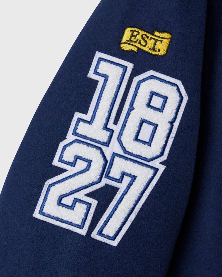 แจ็กเก็ตผ้าสักหลาดขนสัตว์สำหรับผู้ชายผ้ากำมะหยี่ปักโลโก้สำหรับนักเรียนโรงเรียนสีฟ้า